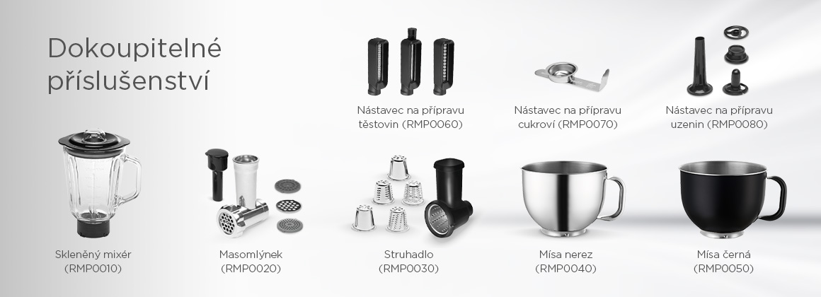 Tento kuchyňský robot je vybaven třemi základními nástavci - šlehací metlou, flexibilní metlou a hnětacím hákem, se kterými zvládne většinu běžných úkonů při pečení i vaření. Pokud ale chcete rozšířit jeho schopnosti, můžete si ho snadno přizpůsobit přesně podle svých potřeb. V nabídce dokoupitelného příslušenství najdete třeba skleněný mixér, struhadlo, náhradní mísy, pasta maker a masomlýnek, ke kterému je možné dokoupit také nástavce výrobu cukroví a uzenin. Z robota si tak snadno sestavíte univerzálního pomocníka přesně na míru svých potřeb.