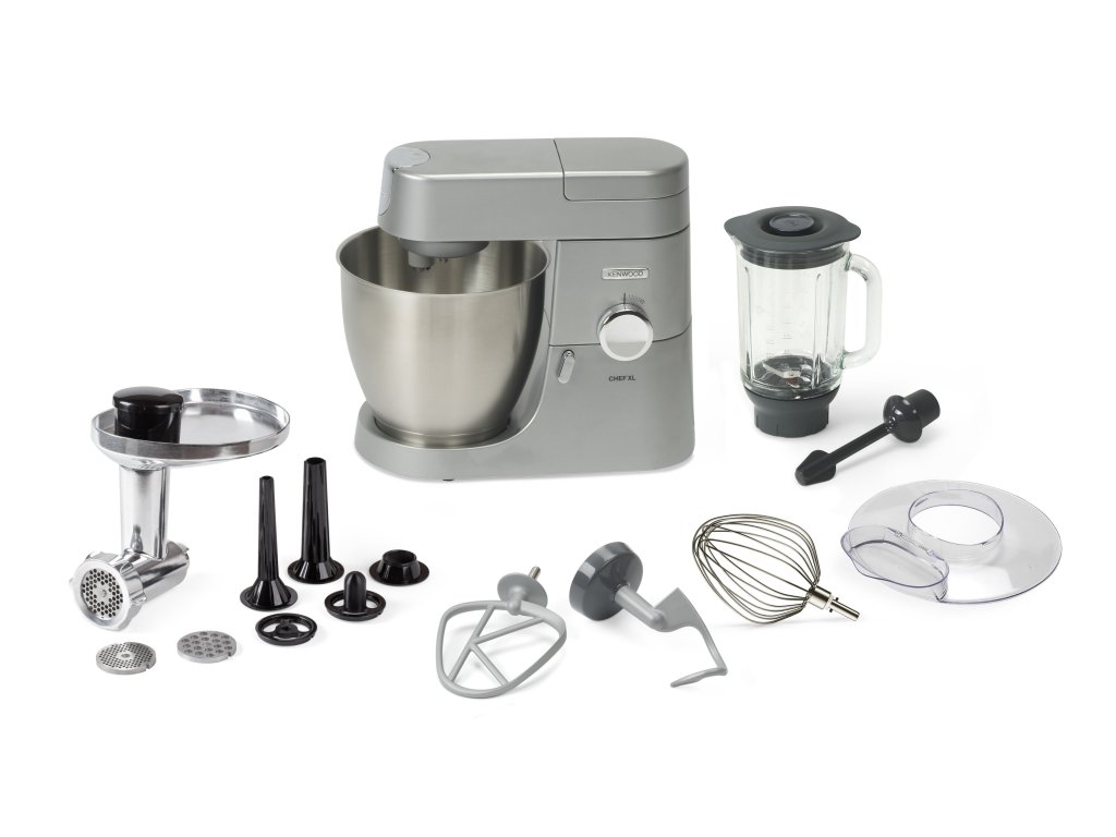 Kuchyňský robot Kenwood Chef XL * výkon 1200 W * variabilní rychlost s pozvolným startem s 6 stupni * pulsní rychlost * nerezová mísa s extra velkým objemem 6,7 l * 3 kovové metly: balonová šlehací metla, hnětací hák, K-metla * kryt proti rozstřiku s širokým plnicím otvorem * barva stříbrná Široká základní výbava: * Skleněný ThermoResist mixér o objemu 1,6 l * kovový mlýnek na maso se 3 mlecími disky a nástavci na domácí uzeniny