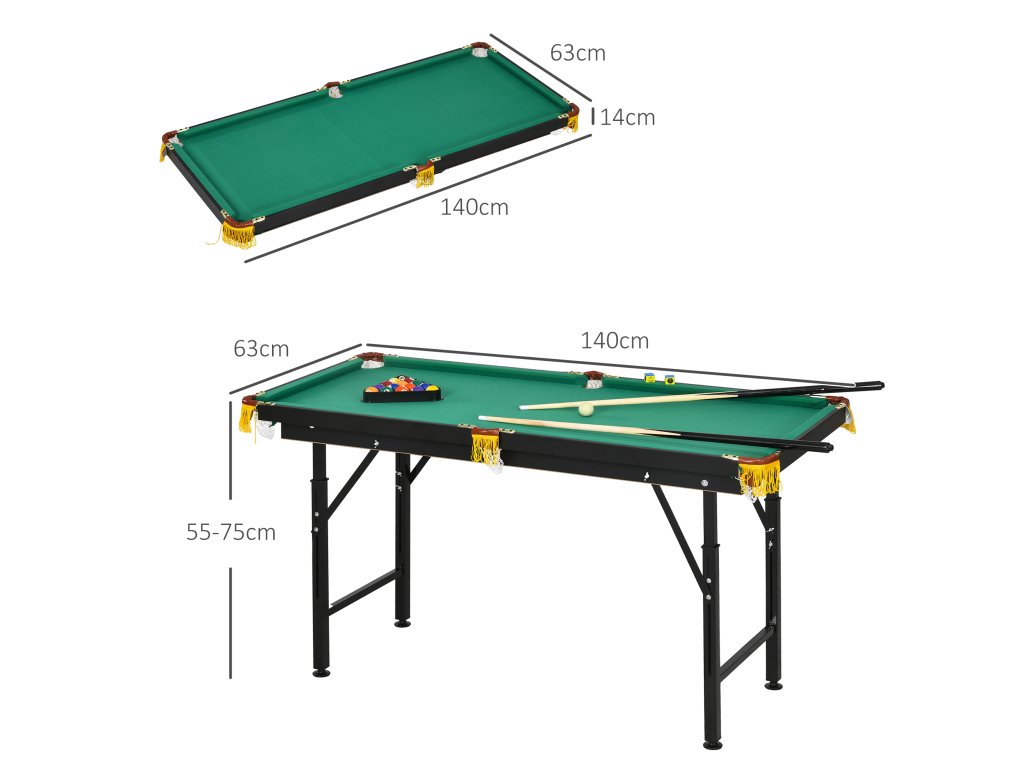 - Rozměry výrobku kulečníkového stolu: 140L x 63W x 55-75H cm. Rozměry skládacího stolu: 145L x 63W x 14H cm. Délka tága: 90 cm. Montáž není nutná