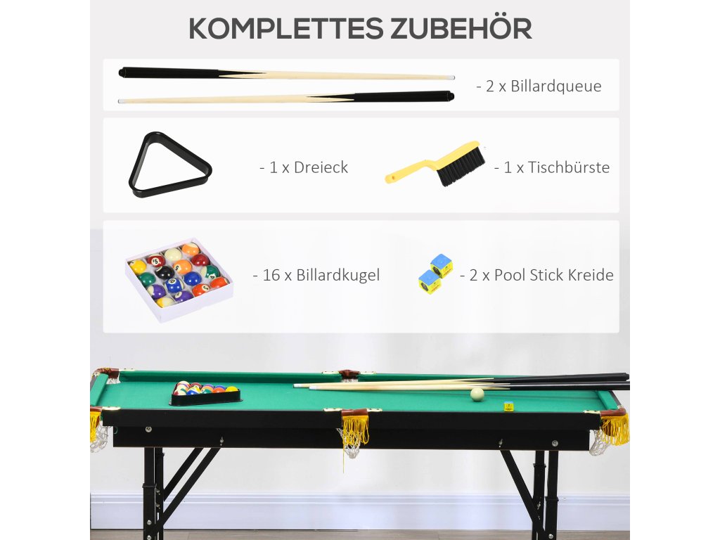 S tímto skládacím kulečníkovým stolem od společnosti SPORTNOW přenesete kulečníkovou akci do svého domova! Rozložte nohy, nastavte výšku a můžete začít: celá rodina zde může prožít svou kulečníkovou horečku. Kulečníkový stůl se dodává se dvěma tágami, kulečníkovými koulemi, křídami, kartáčem a trojúhelníkem, které dokonale doplní kulečníkovou zábavu. Zajímavým akcentem je třásňový dekor na šesti kapsách. Kompaktně složený stůl lze uložit téměř kamkoli.