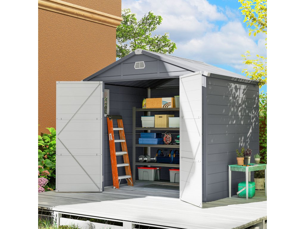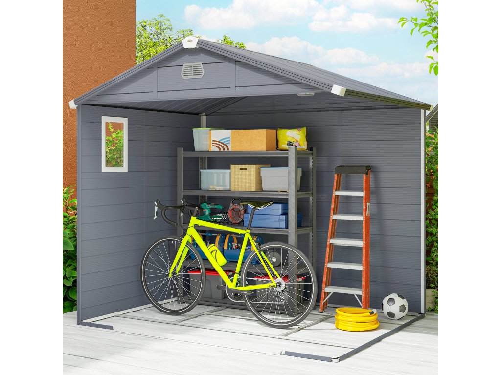 Kůlna na nářadí Outsunny, zahradní kůlna, kůlna na nářadí s větracím oknem, plast, kov, 240 x 190 x 180/228, šedá barva