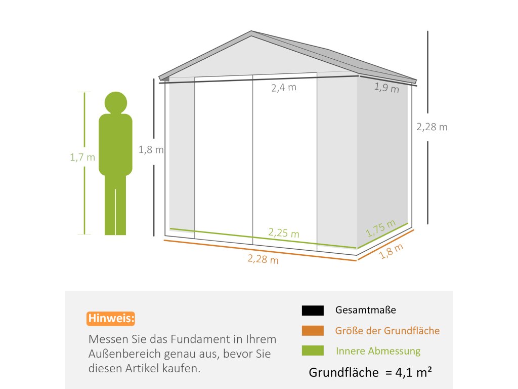 - Údaje o výrobku pro kůlnu na kola: Rozměry: 240L x 190W x 228H cm. Jedny dveře: 74L x 180V cm. K montáži jsou zapotřebí dvě osoby - VŽDY používejte rukavice. Základová sada je součástí dodávky.