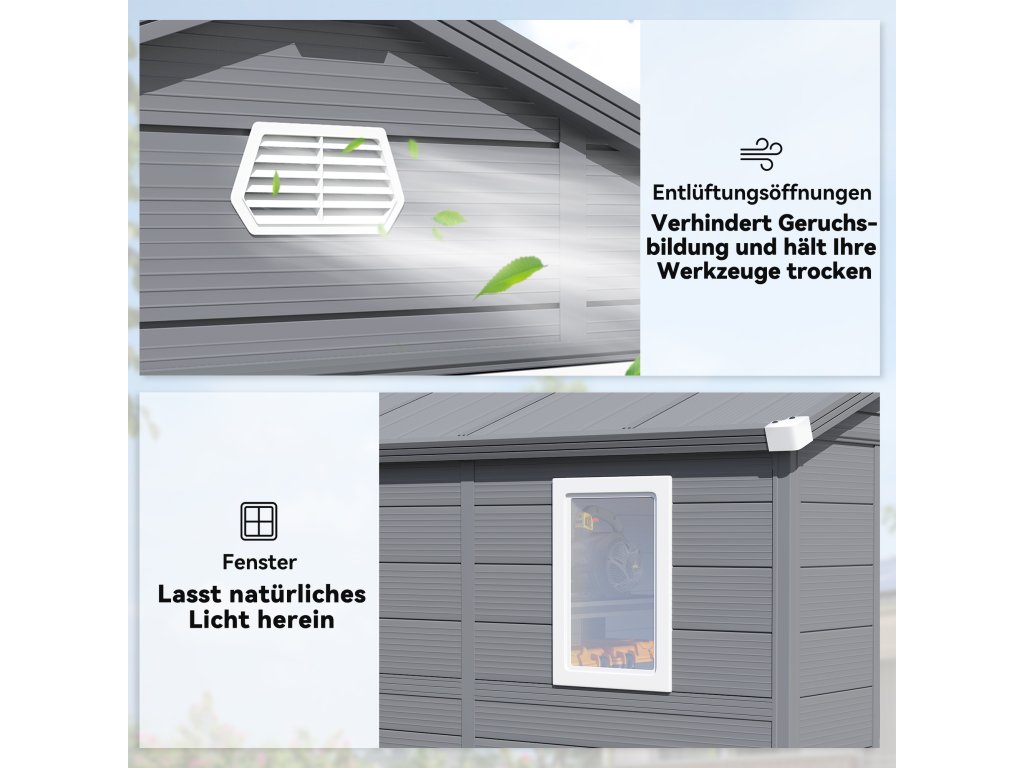 - Dobré větrání: Optimální cirkulace vzduchu díky dvěma horním větracím otvorům a bočnímu oknu kůlny na nářadí, které účinně zabraňují vzniku plísní a vlhkosti uvnitř kůlny