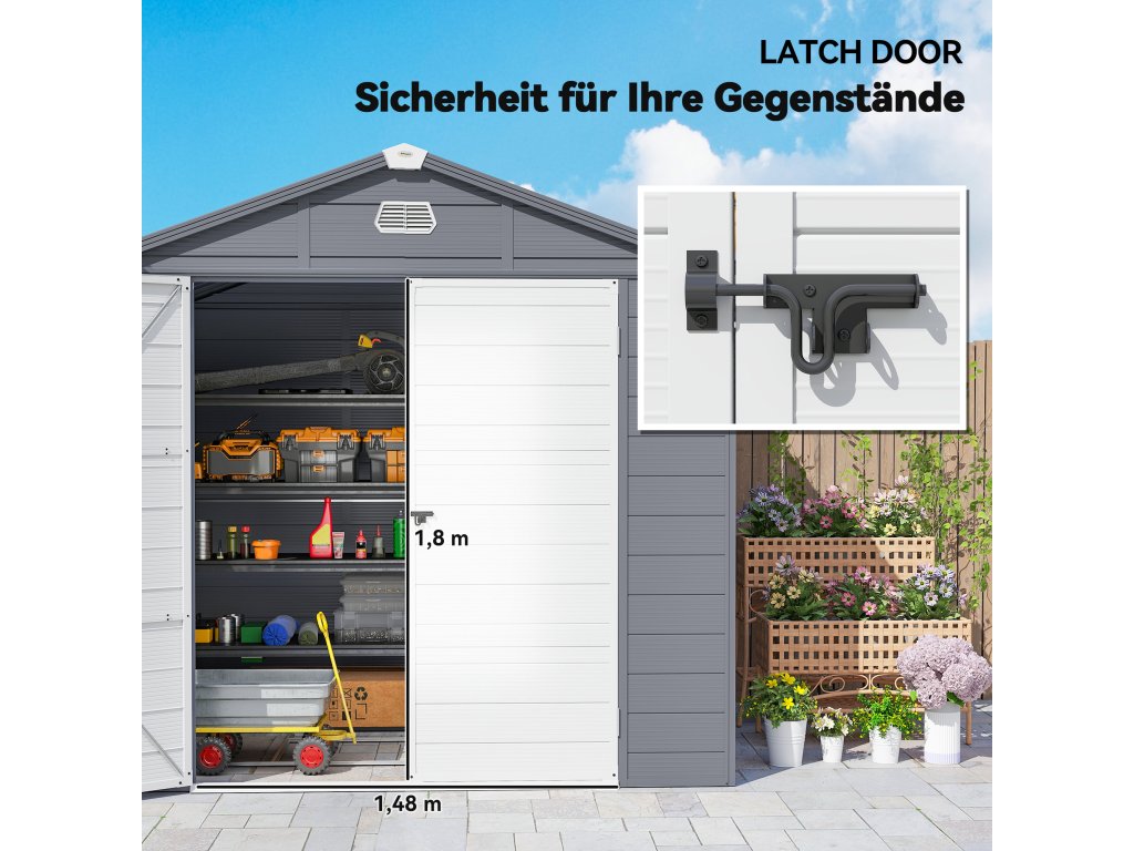 - Snadno přístupný a bezpečný: Prostorné dveře zahradního domku s robustními kovovými západkami umožňují snadný přístup a bezpečné uložení i velkých předmětů