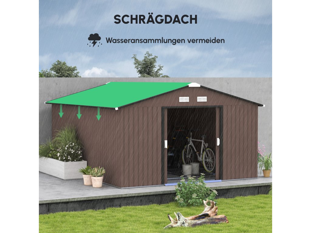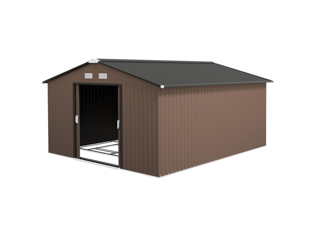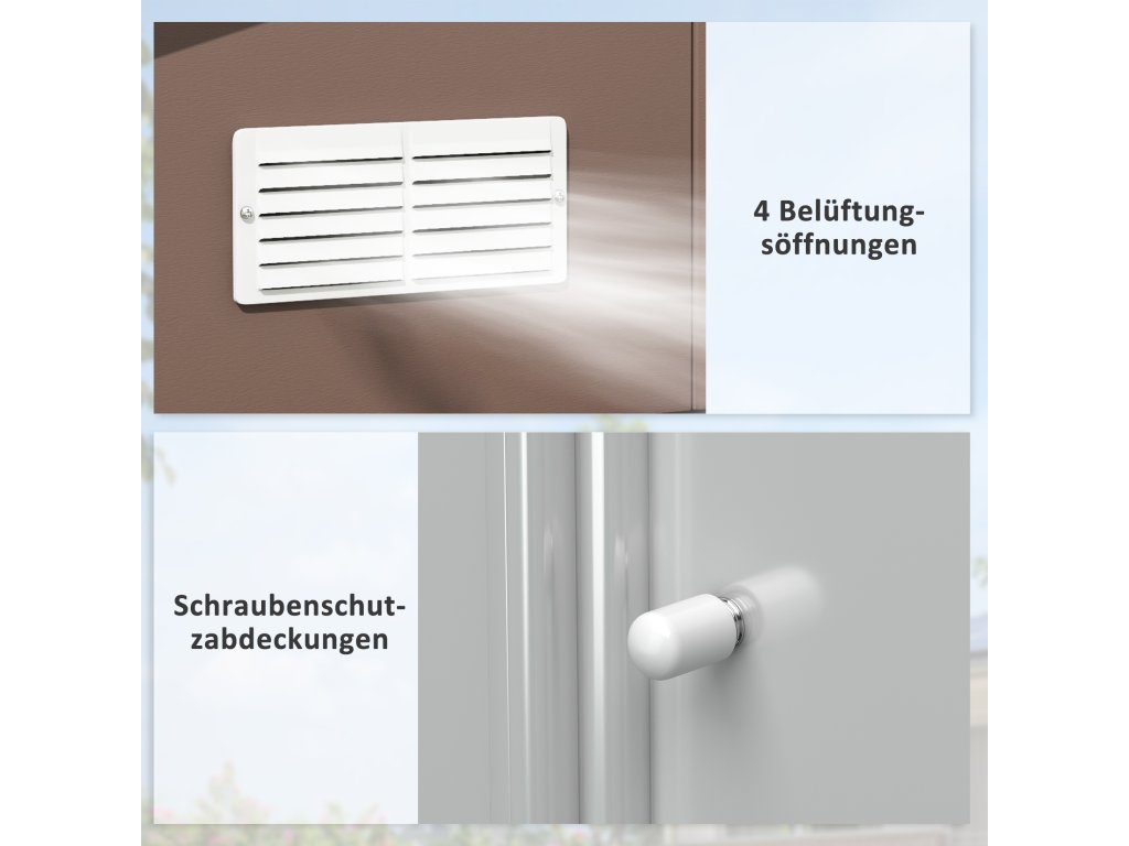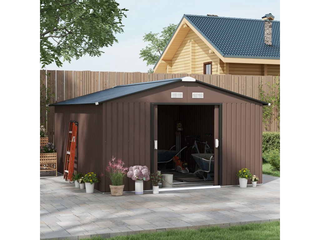 Kůlna na nářadí Outsunny, zahradní kůlna na zahradní nářadí odolná proti povětrnostním vlivům, s větracími okny, posuvné dveře, ocel, hnědá barva