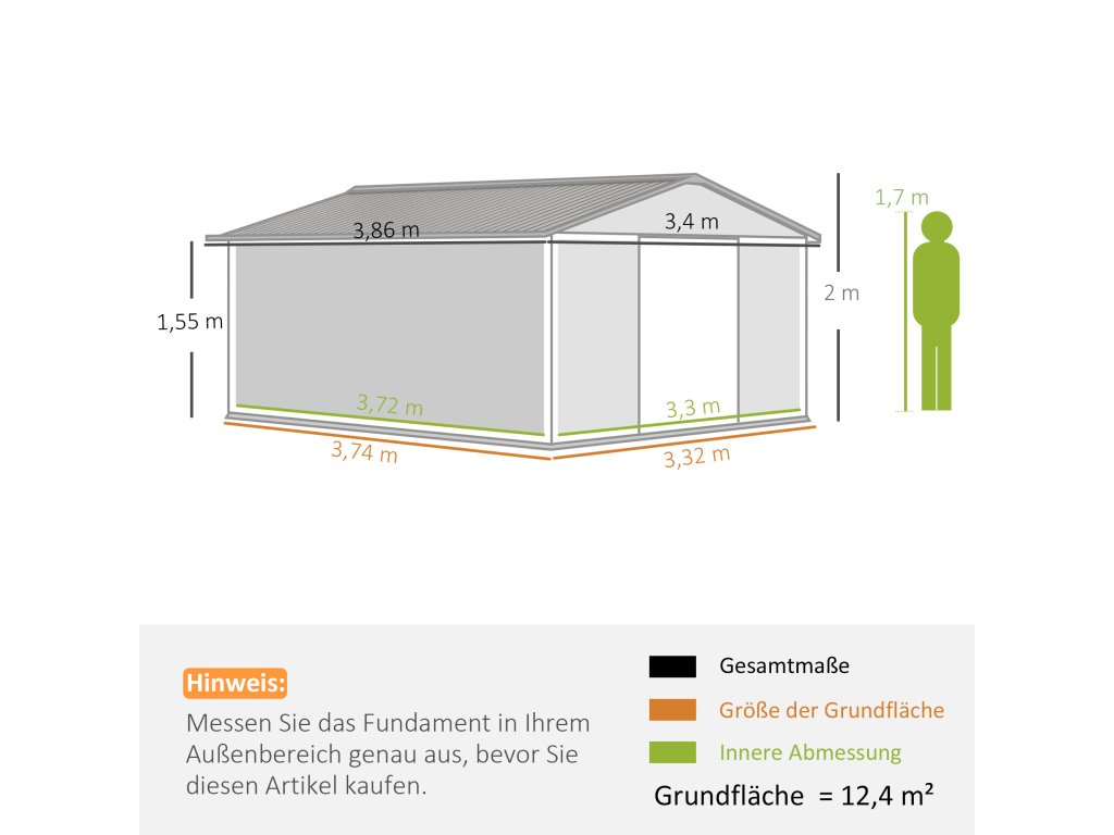 - Celkové rozměry zahradního domku: 386L x 340W x 200H cm.