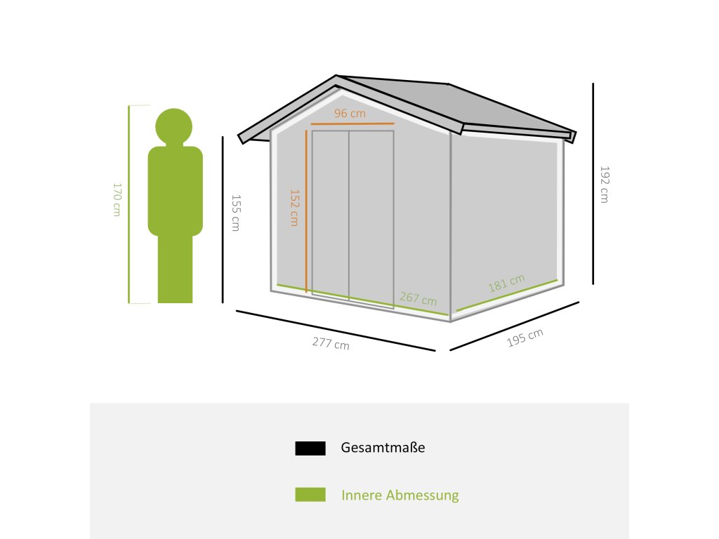 - Celkové rozměry zahradního domku: 277L x 195W x 192H cm.