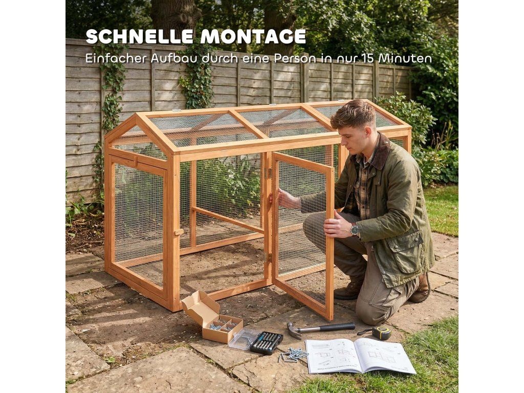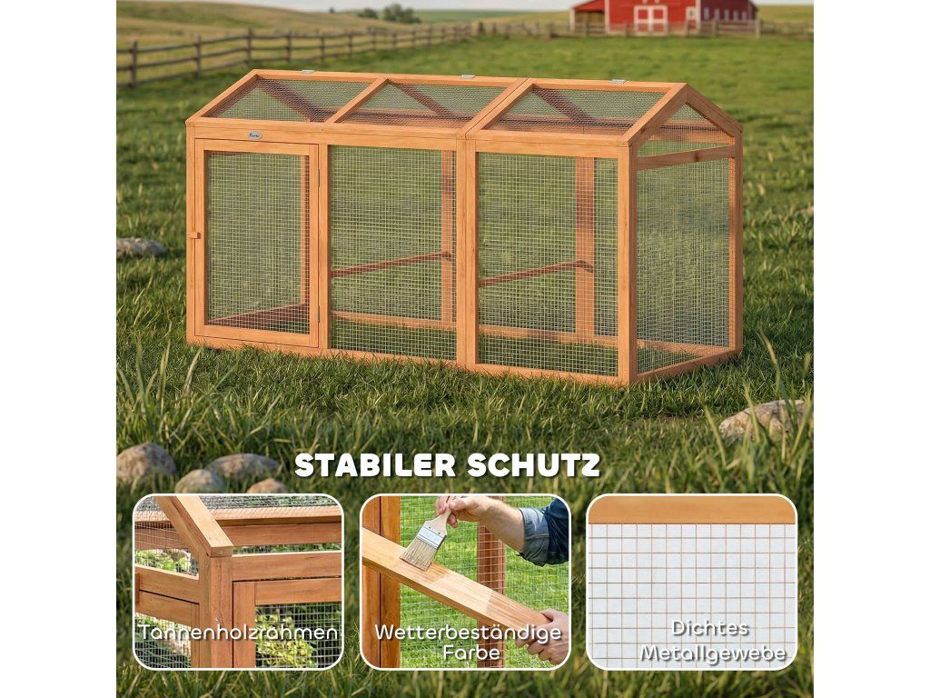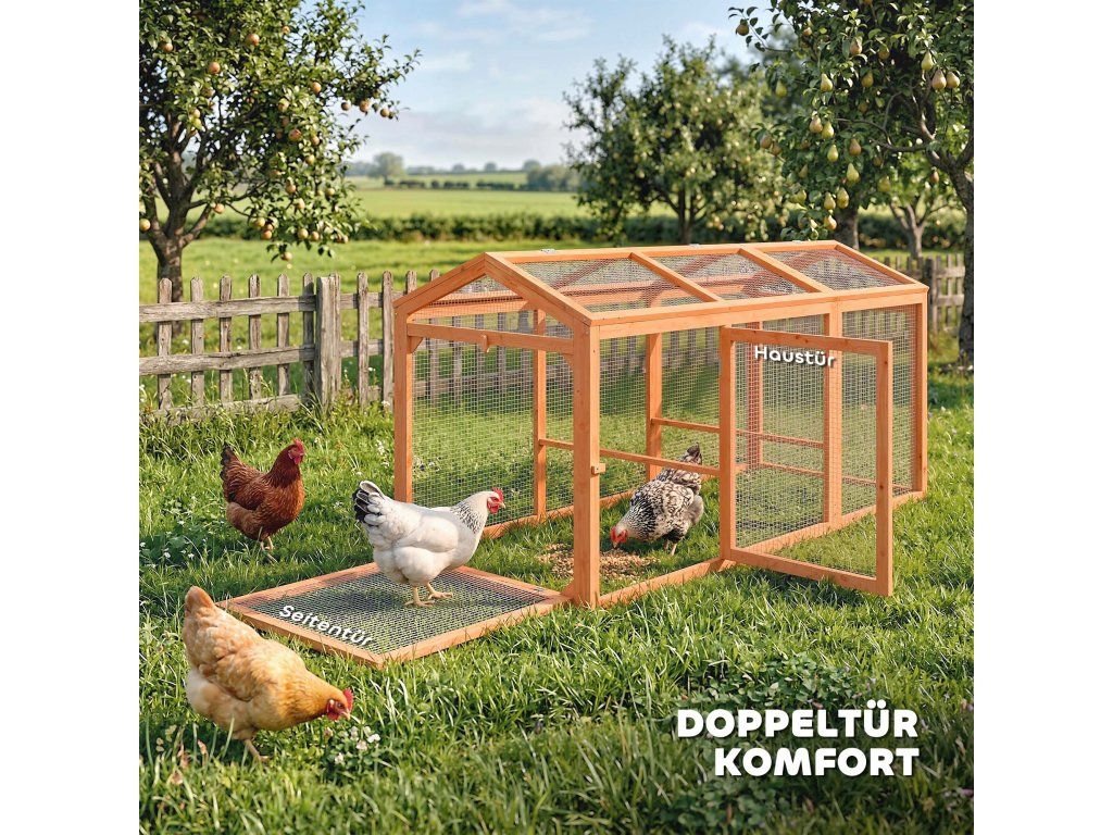Stabilní konstrukce: Výběh se skládá z rámu z jedlového dřeva s certifikací FSC, opatřeného odolnou barvou proti povětrnostním vlivům a vyztuženého hustou kovovou sítí. Poskytuje ochranu pro dvě kuřata před predátory a měnícími se povětrnostními podmínkami a zajišťuje spolehlivé zabezpečení ve vaší zahradě.