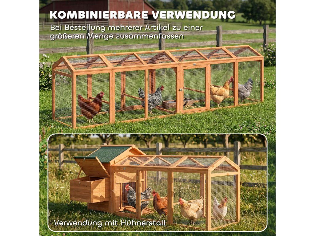 Rozšiřitelná konstrukce: Díky odnímatelným bočním dveřím lze tento modulární výběh pro kuřata snadno připojit k jiným jednotkám nebo použít ve spojení s kurníkem. To vám umožní flexibilně rozšiřovat hrací plochy pro kuřata, kachny nebo husy s tím, jak vaše hejno roste.