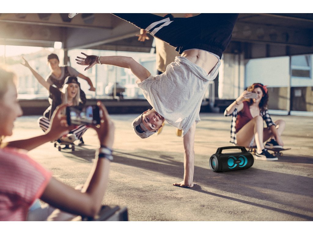 Mít připravený vlastní výběr party songů je top, ale když musíš improvizovat, hodí se i možnost naladit FM rádio a svojí oblíbenou stanici. Kteroukoliv akci si můžeš zkusit také odmoderovat díky přibalenému mikrofonu, který je parádní výbavou i pro karaoke. 3 režimy LED podsvícení na předním panelu ještě dotvoří atmošku. Svůj playlist pak spustíš přes Bluetooth 5.3, který se spáruje s různými zařízeními a je zárukou kvalitního přenosu až na 18 m. Nebo můžeš využít USB, microSD kartu, případně kabel.