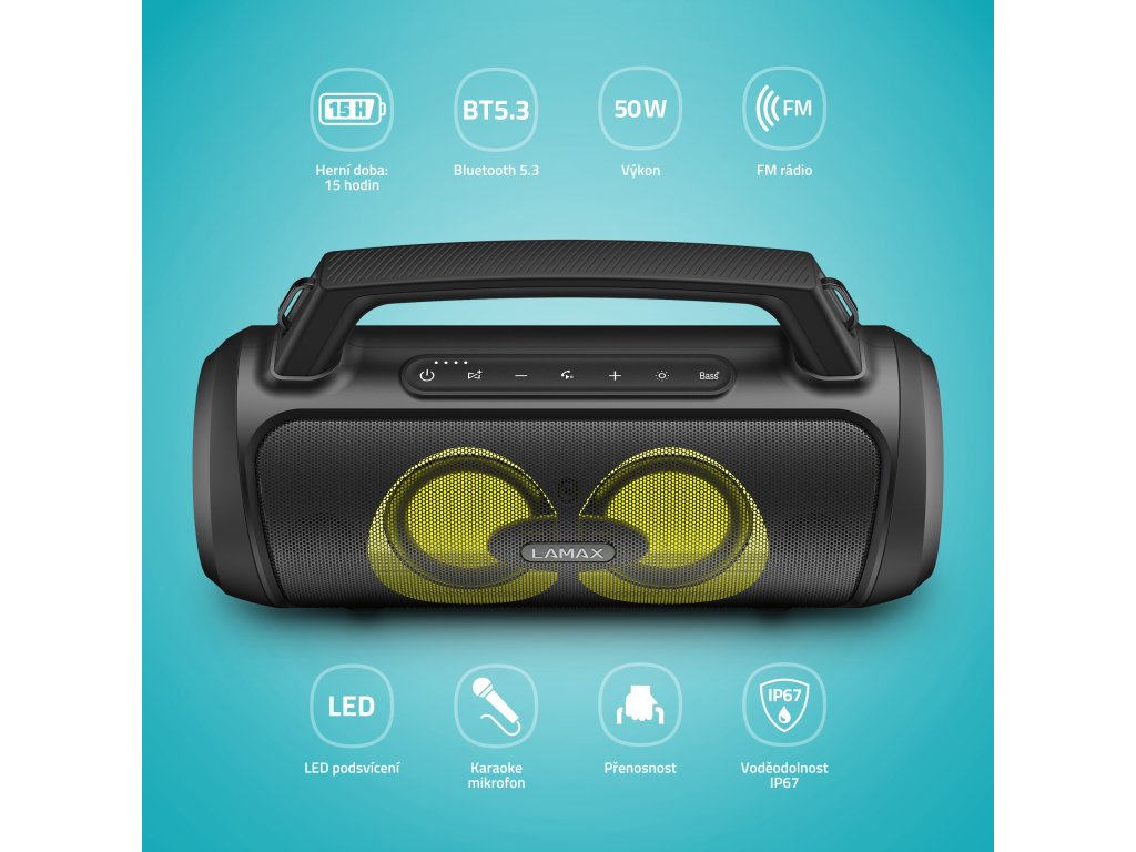 Malé tělo a velký výkon co naladí i rádioUdávej tón každé party s přenosným reproduktorem LAMAX PartyGo1 Play. Jeho nevelké tělo s šikovným madlem ukrývá značný výkon 50 W. Kdekoliv si jen vzpomeneš, naservíruje ti silný, plný a bohatý zvuk díky technologii BeatBass®. Ať už se jedná o pořádnou party nebo zahradní grilovačku, vždy jim dodají ten správný vibe i 3 režimy LED podsvícení a přibalený mikrofon, s nímž si užiješ super karaoke nebo můžeš akci moderovat. Bluetooth 5.3 zařídí okamžité spárování repráku s jakýmkoliv zařízením a jistotu bezchybného přenosu až na 18 m. Připojit ho lze ale i přes USB, microSD, případně AUX a umí se proměnit v powerbanku přes USB-A vstup. Pořádnou muziku si užiješ i na cestách, baterie repráku vydrží až 15 hodin a díky praktickému popruhu si ho pohodlně hodíš přes rameno. Pokud je jeden reprák málo, pomocí True Wireless technologie ho pohodlně spáruješ s dalším. Nemáš zrovna při ruce svůj playlist? Využij FM rádio, který snadno naladíš. Reproduktor podporuje hlasové asistenty a ovládneš s ním i telefonní hovory.