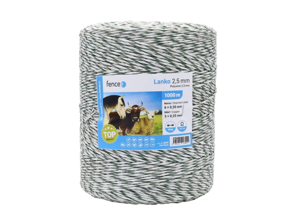 Velmi kvalitní vodivé lanko určené pro univerzální použití u elektrických ohradníků. Pro běžné, ale i náročné instalace. Tři měděné vodiče uvnitř pro dosažení maximální vodivosti. Vhodné i pro dlouhé ohrady.Pevný materiál, odolný proti roztržení s UV ochranou a dlouhou životností. Odolné proti povětrnostním vlivům, nekroutí se. Rychlá a jednoduchá instalace i případné zpětné smotání. Zeleno-bílé barevné provedení.