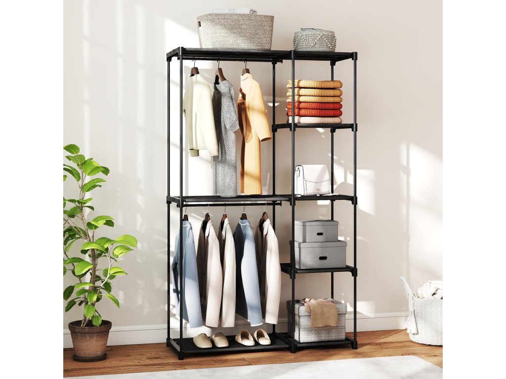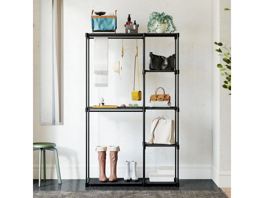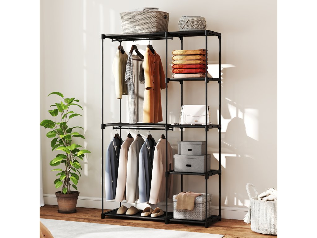 Velký úložný prostor: Tato 111 cm široká přenosná látková šatní skříň je vybavena dvěma 89 cm vysokými šatními tyčemi na dlouhé šaty a kabáty a také šesti policemi na boty a doplňky. Pomáhá nájemníkům a studentům udržovat si oblečení uklizené, přístupné a čisté.