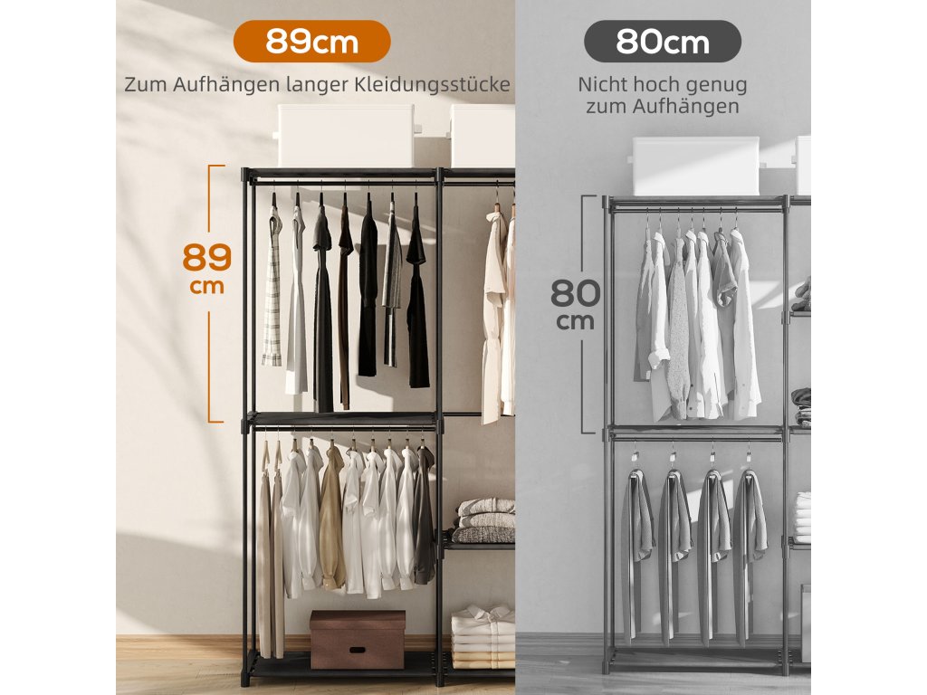 ✔ Dvě závěsné části o výšce 89 cm zabraňují tomu, aby se dlouhé kabáty dotýkaly podlahy.