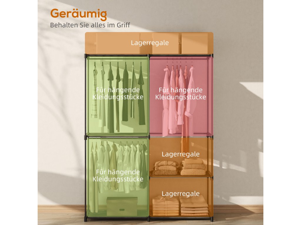 ✔ Látková skříň má 2 šatní tyče a 6 polic pro úhledné a organizované uložení.