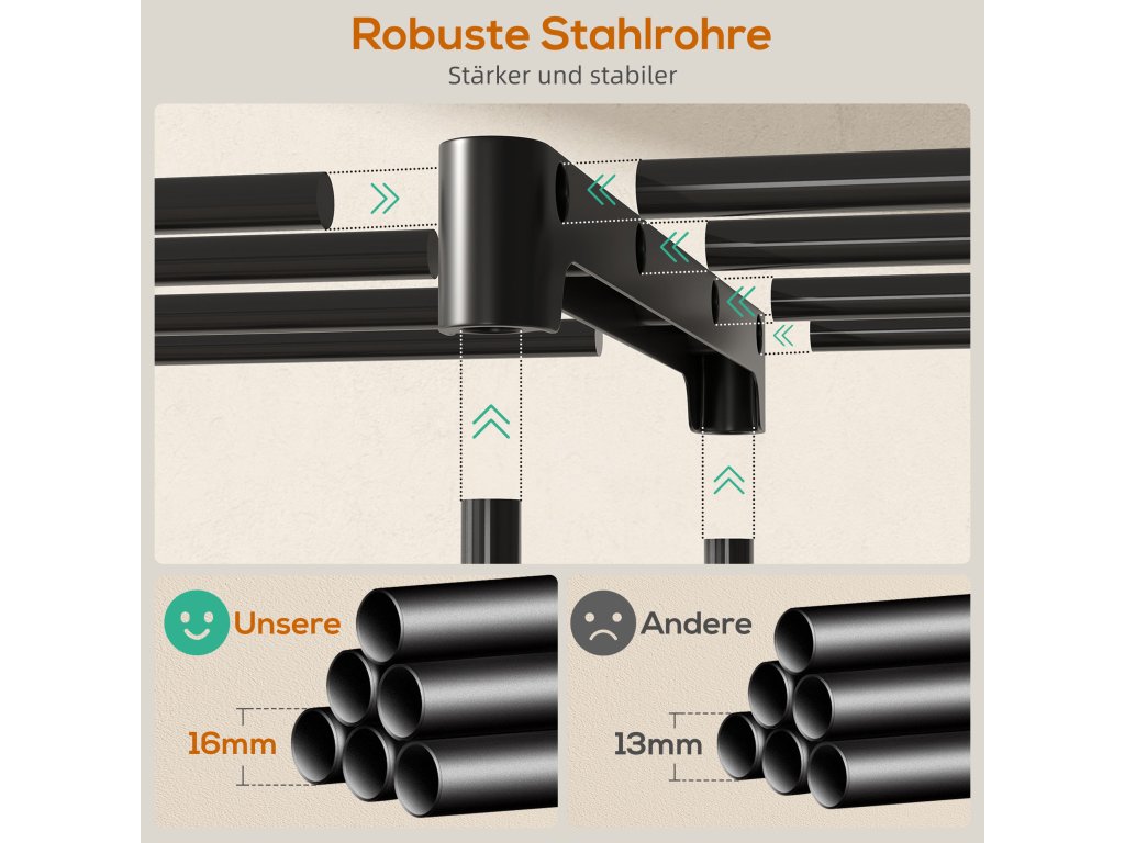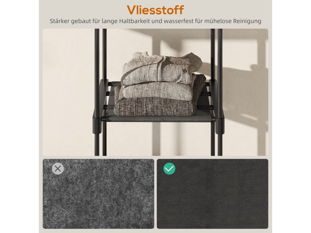 Robustní a spolehlivá: Vyrobeno z vyztužených ocelových trubek o průměru 16 mm a netkané textilie, každá velká police a šatní tyč skříně pojme až 15 kg látky a každá menší police až 5 kg. To umožňuje maximální nosnost celé jednotky 120 kg.