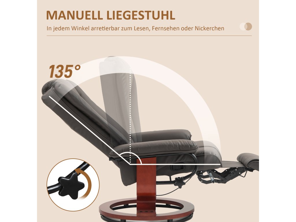 - ✔ Opěradlo televizního křesla lze naklonit až do úhlu 135°, včetně integrované opěrky nohou pro optimální relaxaci