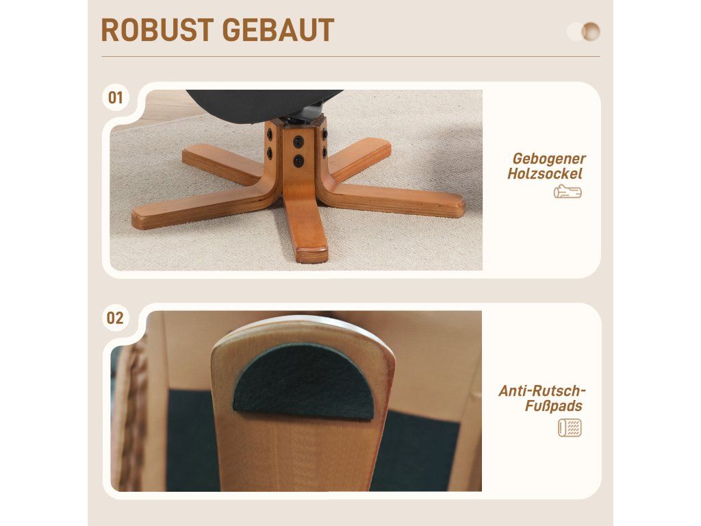 - Robustní a stabilní: Televizní křeslo má zakřivený dřevěný rám, který tvoří pevnou základnu a zaručuje stabilitu, zatímco protiskluzové nožky chrání vaši podlahu před poškrábáním