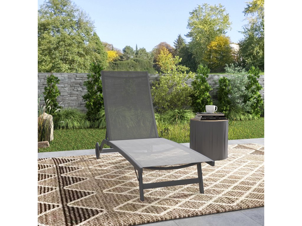 - Nastavitelné opěradlo: Opěradlo zahradního lehátka lze nastavit do 5 poloh (102 cm, 93 cm, 80 cm, 65 cm a 34 cm od země) a lze jej sklopit do úhlu 175° pro čtení, relaxaci a spánek.