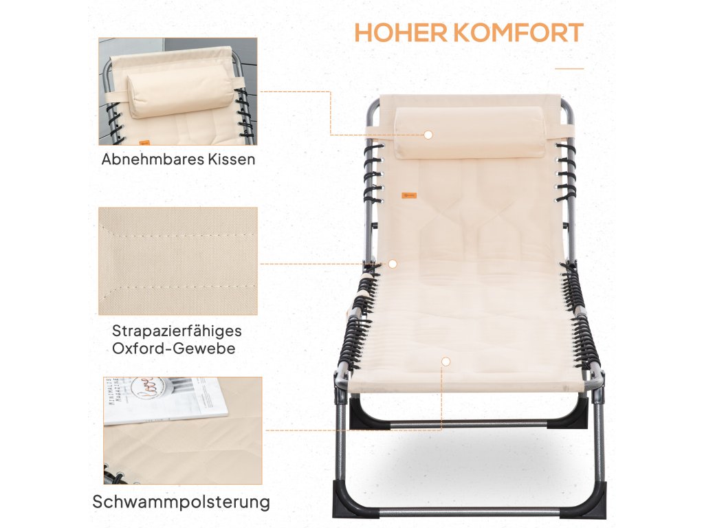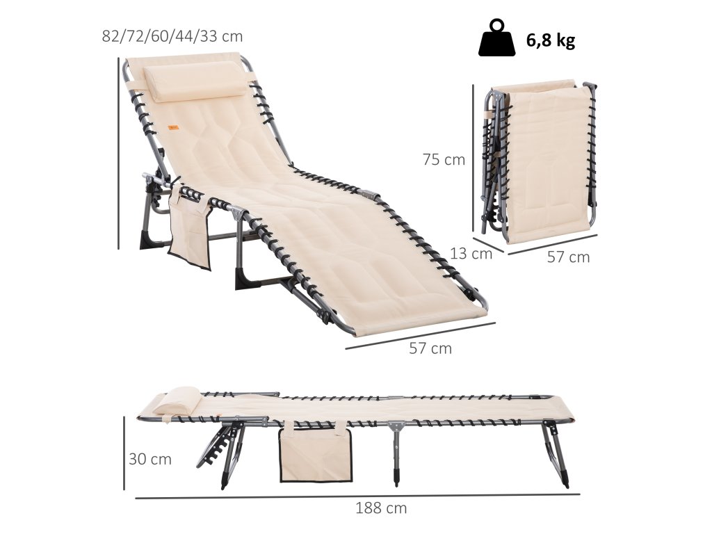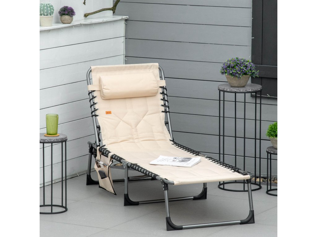 Lehátko Outsunny, skládací zahradní lehátko, skládací lehátko s polštářem, 5stupňové opěradlo, tkanina Oxford, 188 x 57 x 30 cm, béžová barva