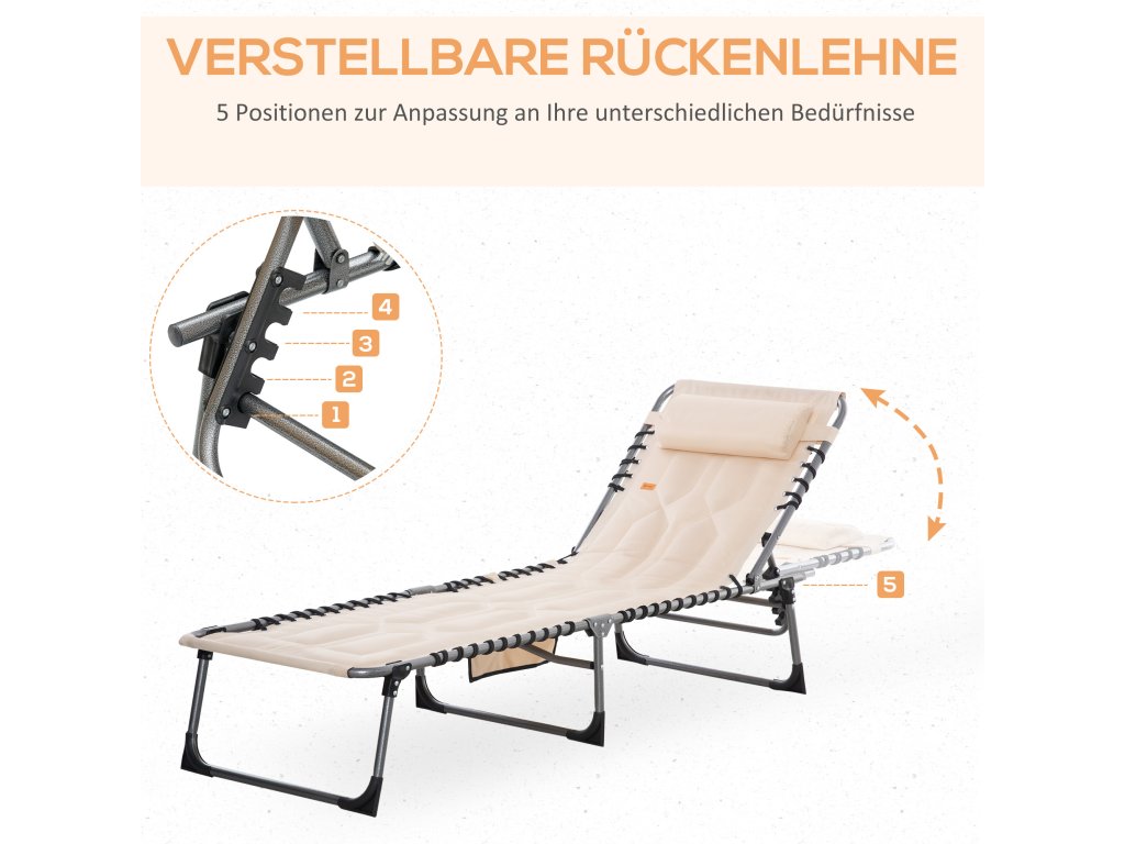 Užijte si odpočinek na čerstvém vzduchu s tímto skládacím lehátkem od společnosti Outsunny, které je odolné proti povětrnostním vlivům. Opěradlo skládacího lehátka lze nastavit do pěti poloh, aby vyhovovalo různým potřebám. Robustní rám a měkké, příjemné čalounění sklápěcího lehátka zajišťují pohodlné ležení, zatímco odnímatelný polštářek podepře vaši hlavu a krk. Skládací lehátko lze také snadno složit do kompaktních rozměrů, což usnadňuje jeho přepravu a skladování.