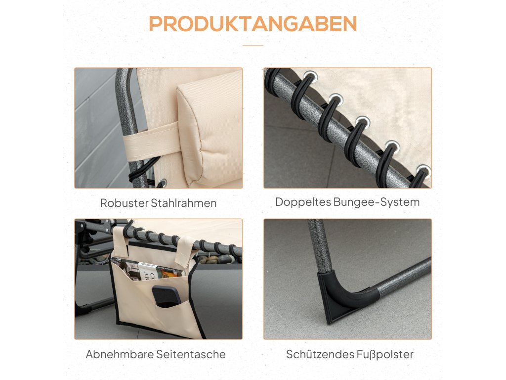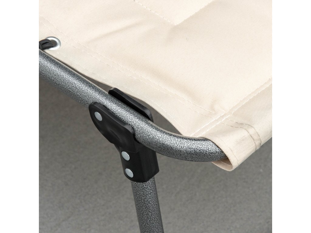 - Vyvážený design: Směs odolné oxfordské tkaniny a robustního ocelového rámu lehátka nabízí pohodlí a odolnost, ať už si užíváte slunce u bazénu, nebo odpočíváte ve stínu pod stromem