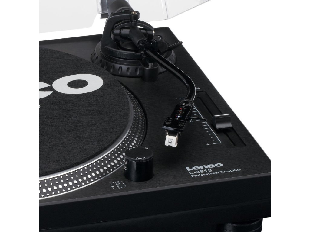 Lenco L-3818BK je kvalitní, profesionální gramofon s přímým pohonem, který je vhodný pro DJ i běžný poslech hudby. Talíř gramofonu je vybaven osvětlením a stroboskopem. Snadno upravíte rychlost pomocí jemné regulace otáček. Lenco L-3818 můžete připojit přímo ke stereo zesilovači, mixážnímu pultu nebo aktivním HiFi reproduktorům. Vestavěný předzesilovač lze vypnout a použít jiný externí.