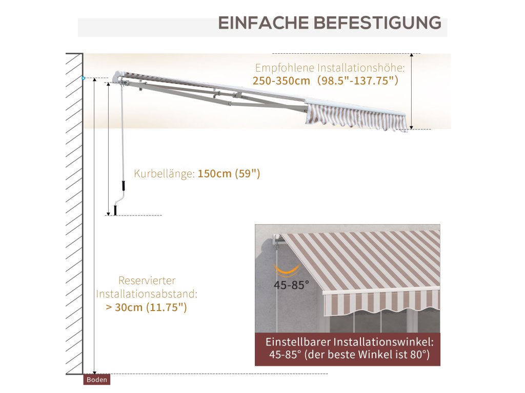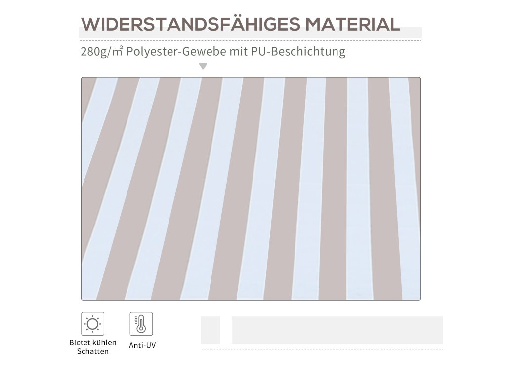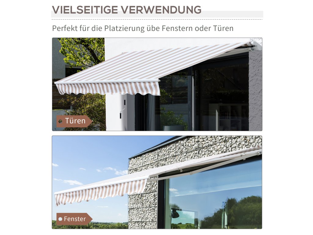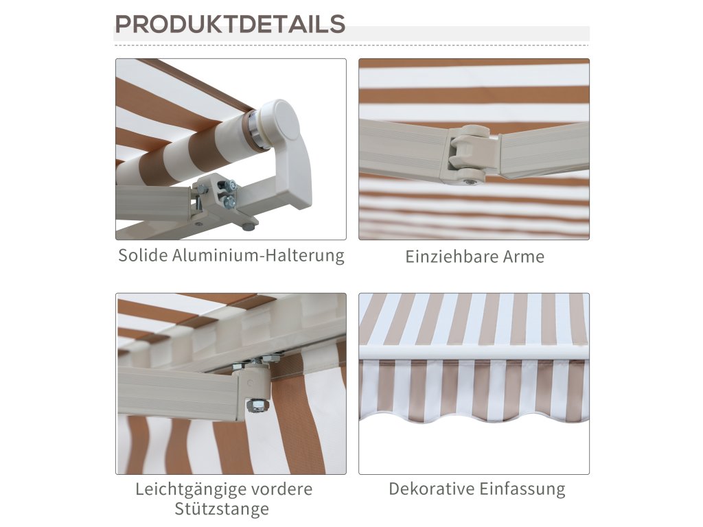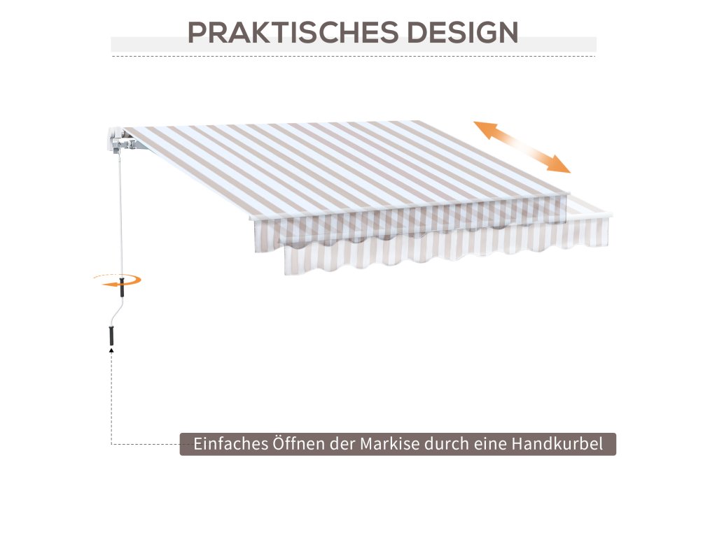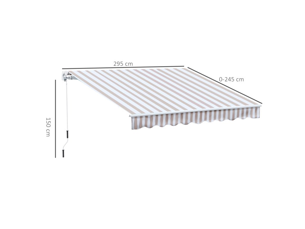 Tato markýza o rozměrech 2,95 x 2,45 m je úspěšným rozšířením vašich venkovních prostor. Markýzu lze snadno instalovat nad vchody, okna nebo balkony. Konstrukce vás ochrání před nebezpečným UV zářením. Skládací rameno se ovládá pomocí praktické kliky, kterou můžete použít k vysunutí a zasunutí sluneční stříšky. Můžete tak odpočívat a užívat si teplé měsíce v roce.