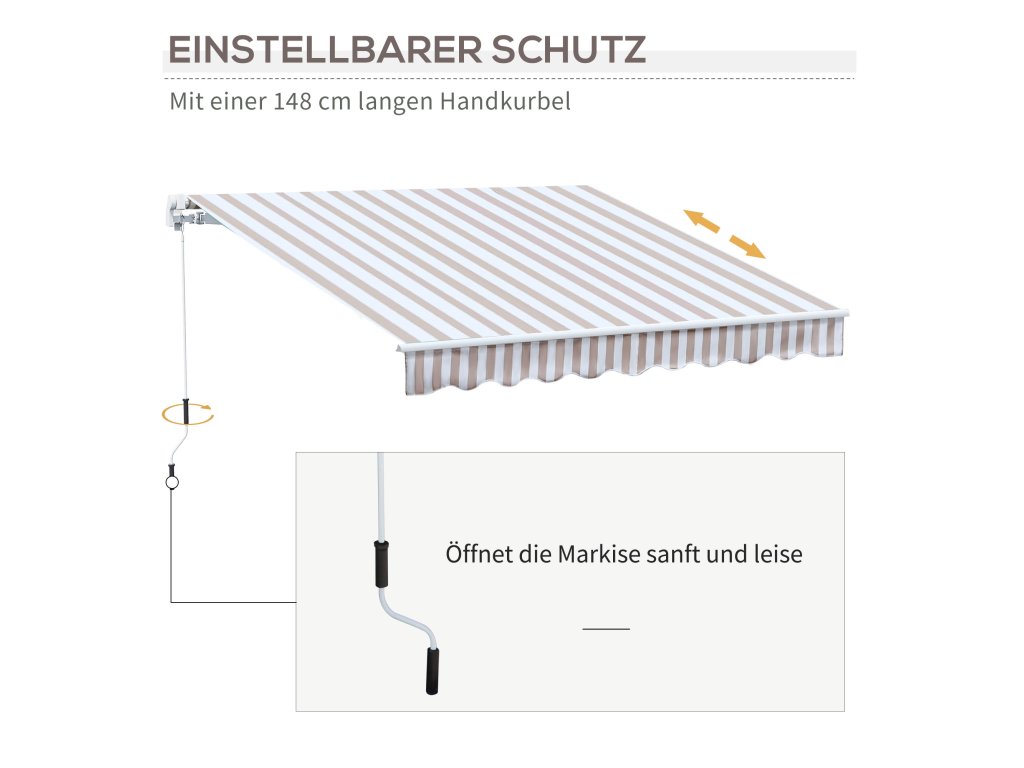 - Nastavitelnost: Markýzu lze snadno a tiše nastavit ručně pomocí ruční kliky o délce 148 cm.