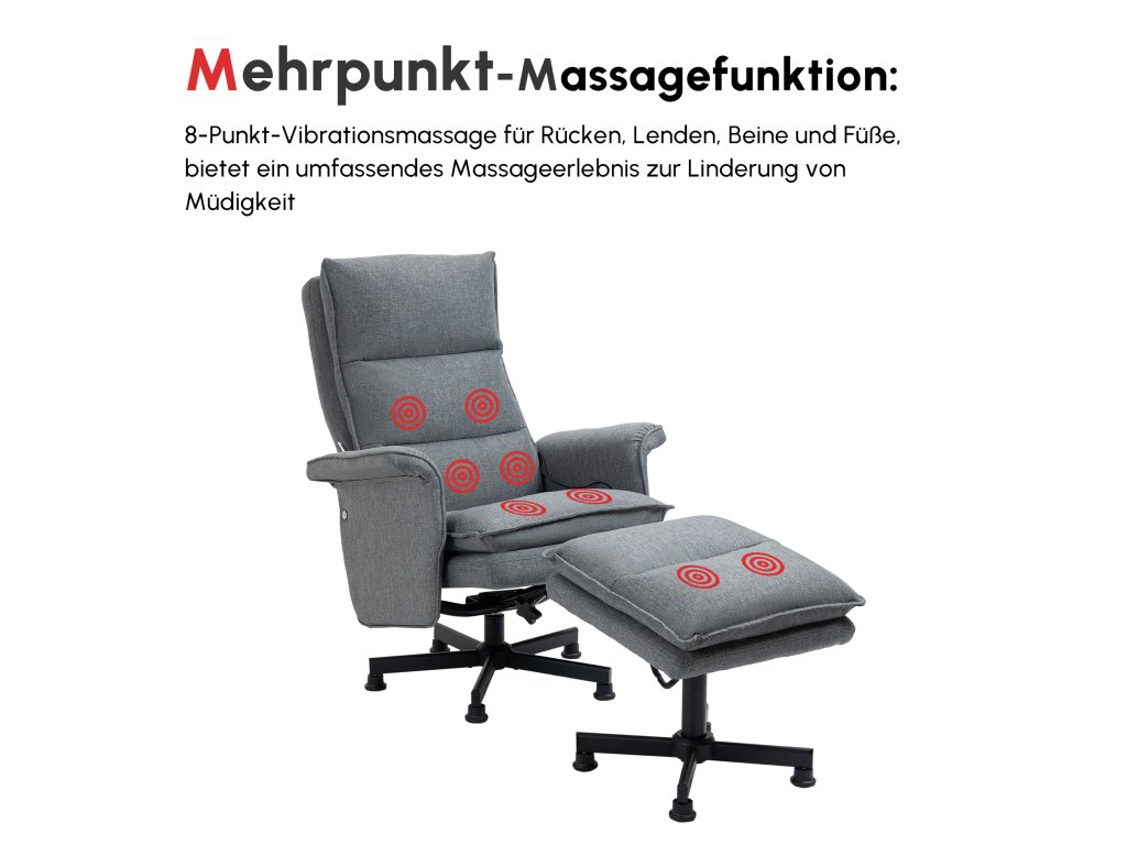 Po náročném dni si můžete v tomto masážním křesle HOMCOM sednout, relaxovat a užít si důkladnou masáž. Masážní body jsou rozmístěny po zádech, bederní oblasti, stehnech a nohou. Můžete si zvolit automatickou funkci pro předprogramované masáže nebo manuální funkci pro vlastní vychutnání různých masáží. Tato sada polohovacího křesla a podnožky je skvělým kusem nábytku do vašeho domova, který zlepšuje kvalitu vašeho života a celkovou pohodu.