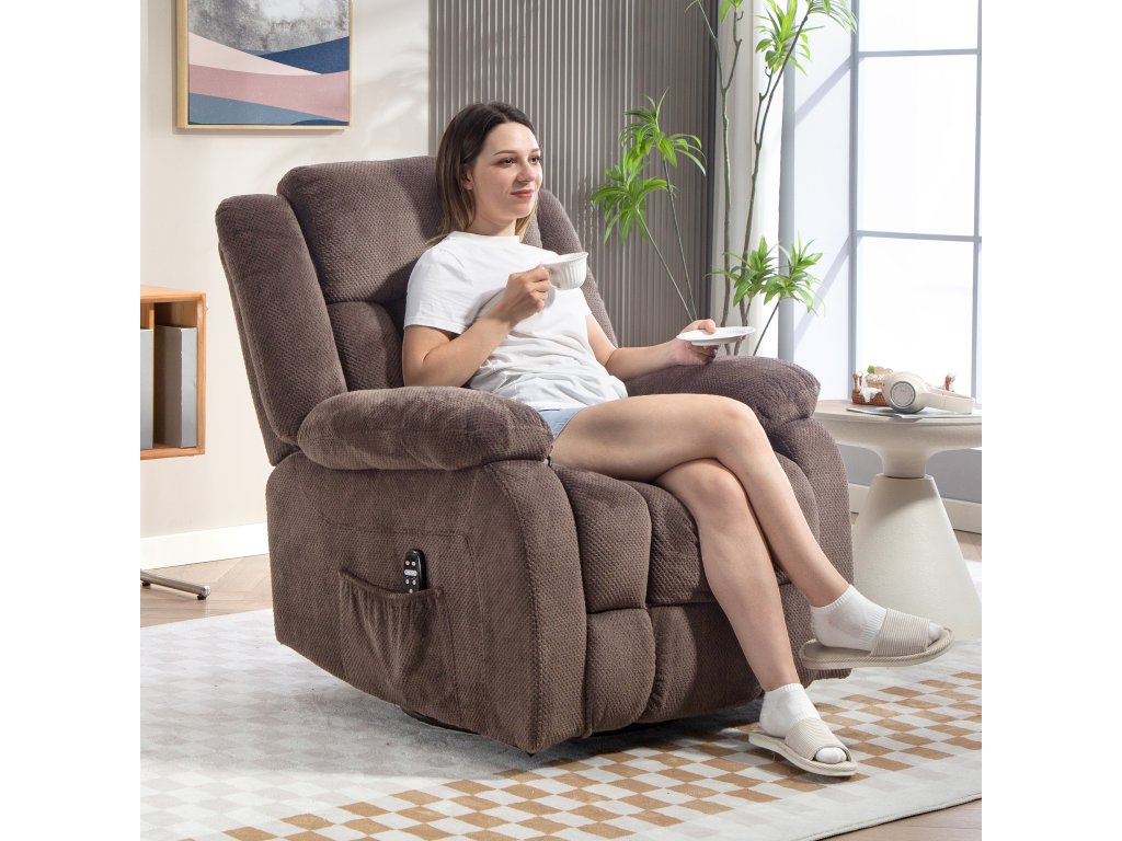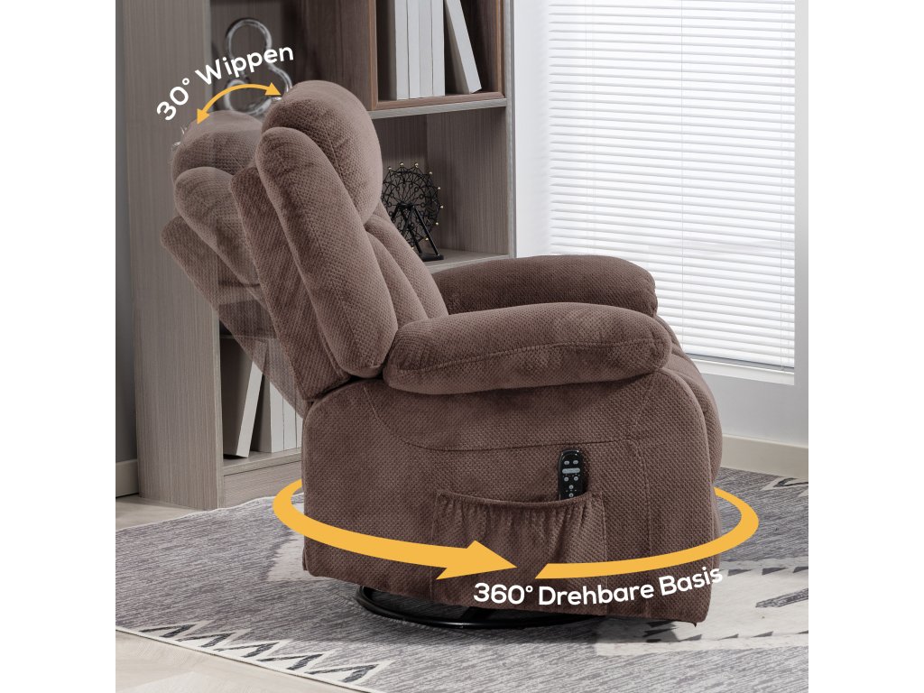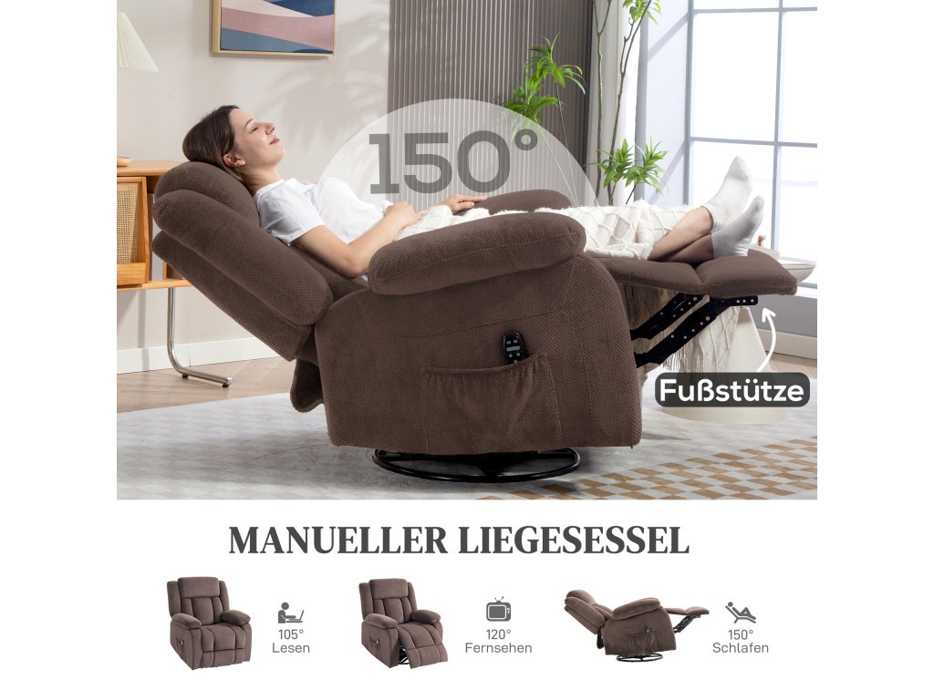 Přizpůsobené pohodlí a otáčení: Zatažením za boční jazýček lze prostorné TV křeslo naklonit ze svislé polohy do polohy sklopení o 150°, čímž se zvedne opěrka nohou. Otočná základna o 360° umožňuje plynulé otáčení a funkce houpání zvyšuje relaxaci pro mimořádně pohodlný zážitek.