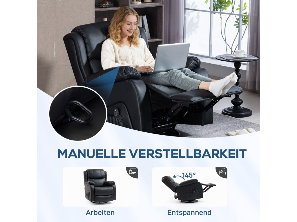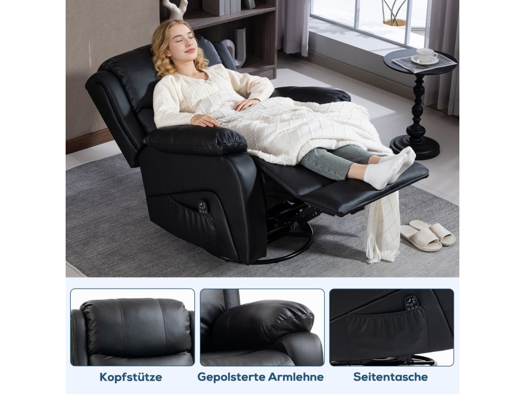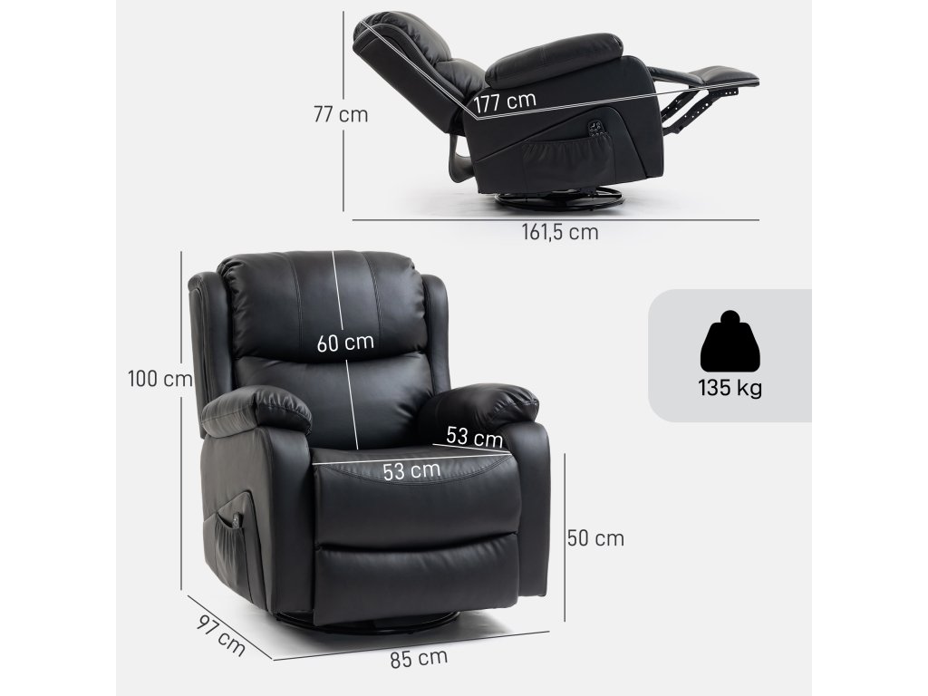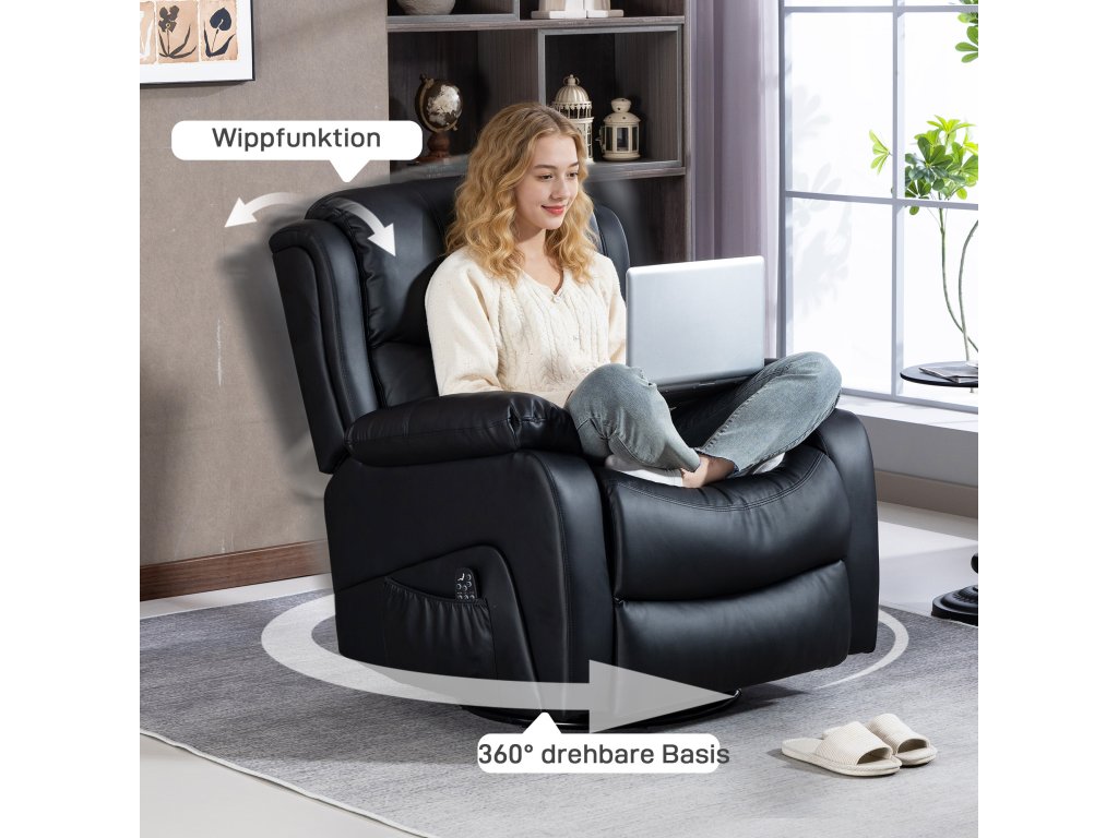 Zažijte maximální pohodlí s měkkým, extra polstrovaným masážním křeslem od HOMCOM! Osm vibračních bodů – umístěných na zádech, pase, stehnech a lýtkách – uvolňuje napětí, zatímco integrované vyhřívání poskytuje uklidňující relaxaci. Dálkové ovládání TV křesla umožňuje snadné ovládání. Díky nastavitelnému opěradlu, opěrce nohou a elegantní povrchové úpravě z umělé kůže stylově vylepší každou místnost.