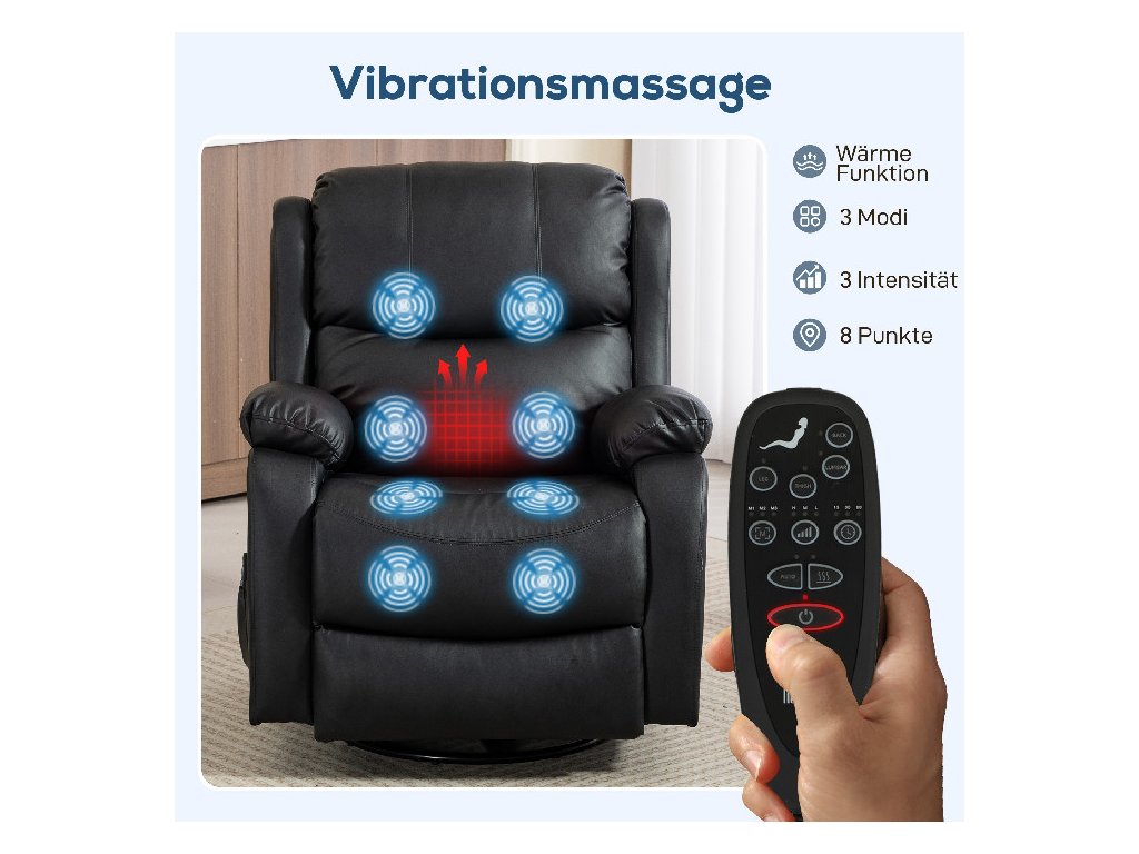 ✔ Osm vibračních masážních bodů na polohovacím křesle pro záda, bederní oblast, stehna a lýtka
