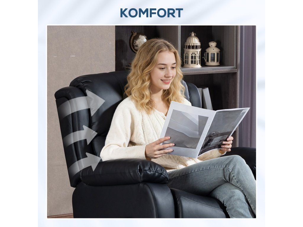 Podporné pohodlí při sezení: Pružinové polstrování, měkká bavlna a pěna s vysokou hustotou s povrchem z umělé kůže, který se snadno udržuje, nabízejí perfektní rovnováhu mezi oporou a pohodlím, které se ideálně přizpůsobí vašemu tělu. Široké, dobře polstrované sedátko polohovacího křesla zajišťuje dlouhodobé pohodlí při čtení nebo sledování televize.