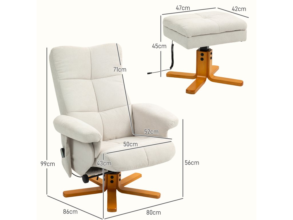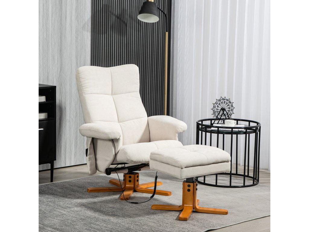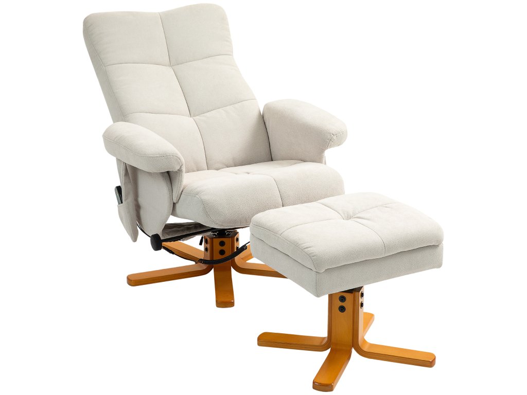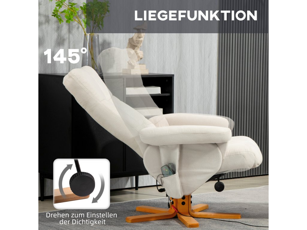 Masážní křeslo HOMCOM s funkcí polohování a podnožkou, sklon 145°, polyester, 80 x 86 x 99 cm, krémově bílá
