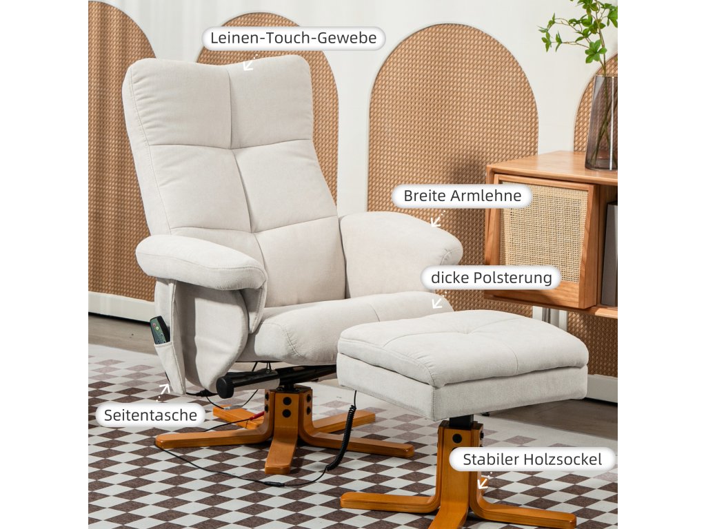 - Wellness masáž: Masážní křeslo má vibrační desetibodovou masážní funkci pro záda, bederní oblast a nohy. Každou masážní zónu lze individuálně nastavit. Úrovně intenzity, režimy a dobu trvání lze ovládat dálkovým ovladačem