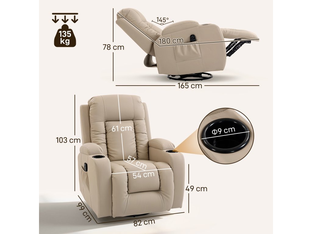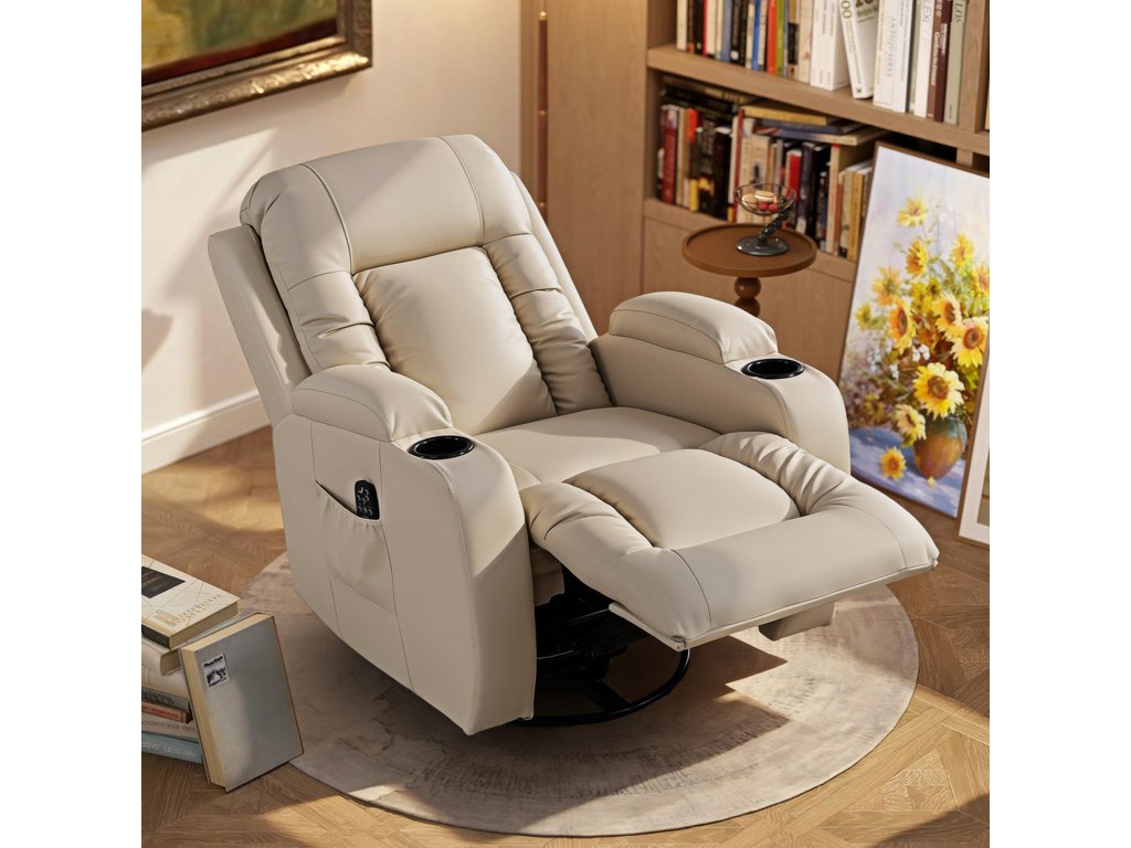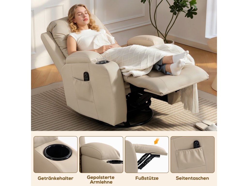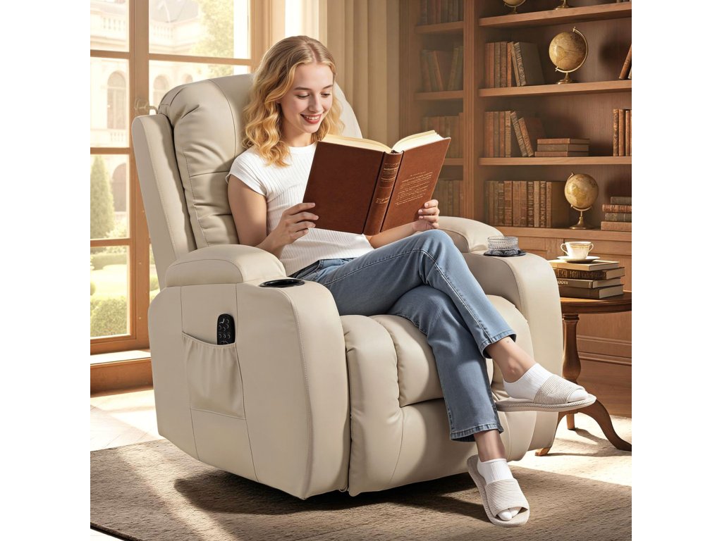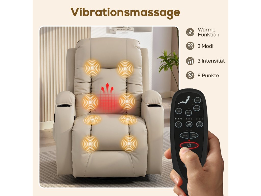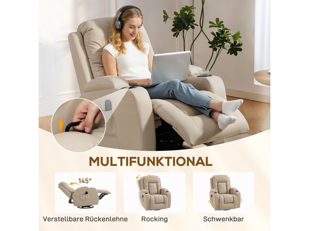 Vyhřívaná masáž a relaxace: S osmi vibračními body pro záda, bederní páteř, stehna a lýtka, tři režimy, časovač 15/30/60 minut a vyhřívání bederní páteře pro uvolnění napětí. Toto polohovací křeslo nabízí teplou, uklidňující masáž pro relaxaci celého těla.