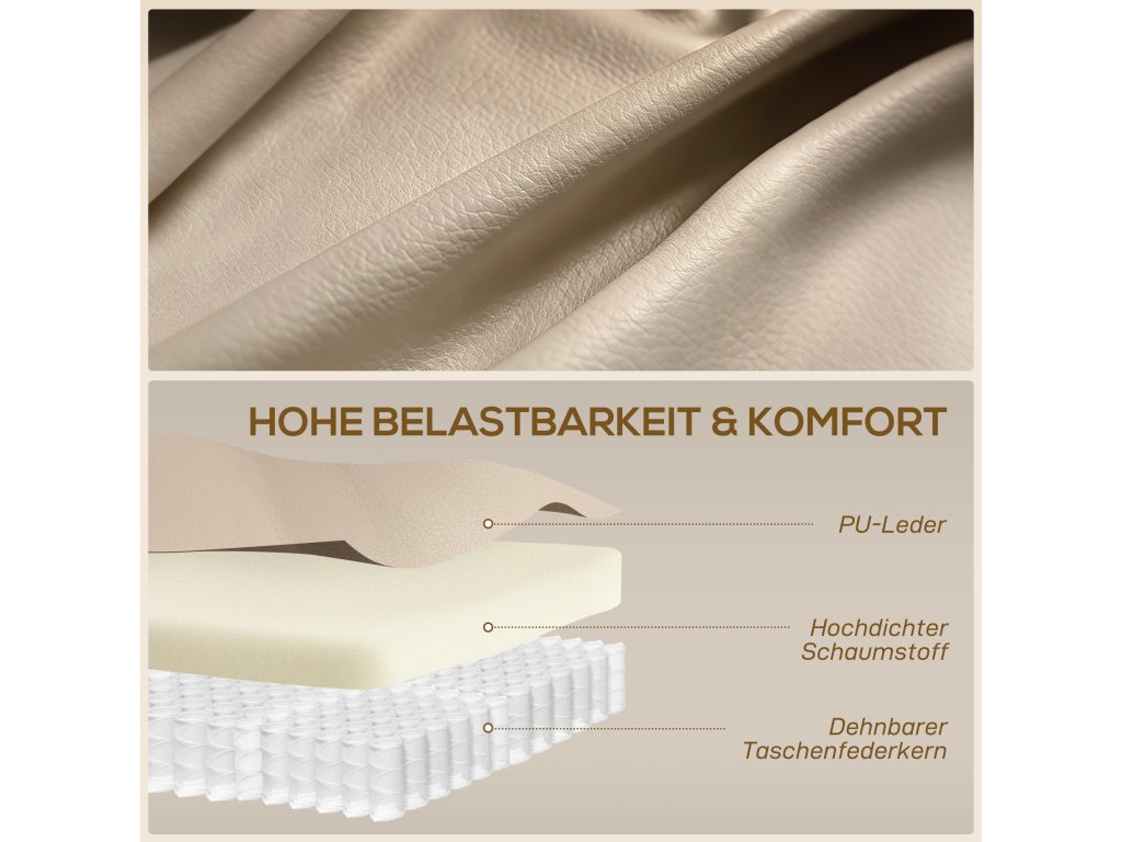 Pohodlné pohodlí: Zabořte se do měkké, snadno udržovatelné umělé kůže. Husté pěnové polstrování a integrované pružiny zajišťují trvalé pohodlí. Měkké polštáře, silné loketní opěrky a podpůrná opěrka hlavy se přizpůsobí vašemu tělu a vytvoří útulné místo pro relaxační přestávku nebo zdřímnutí.