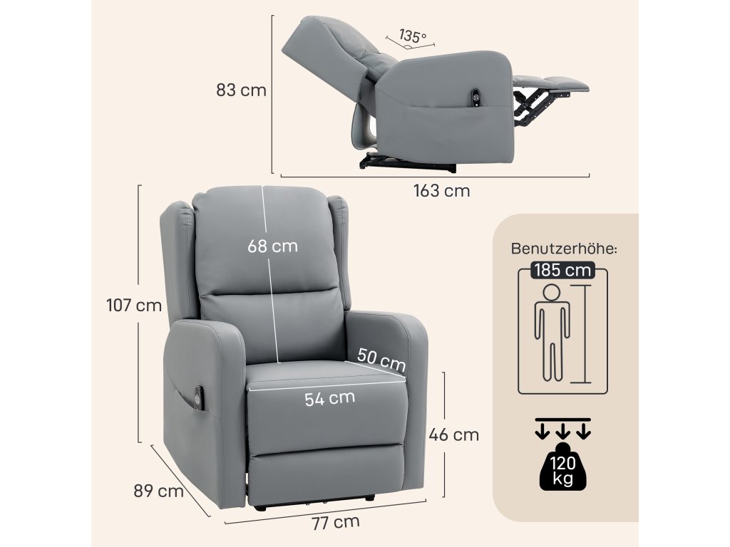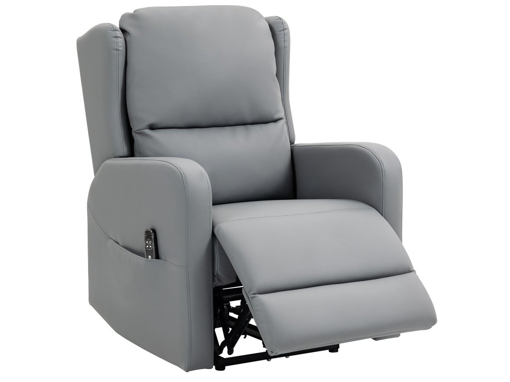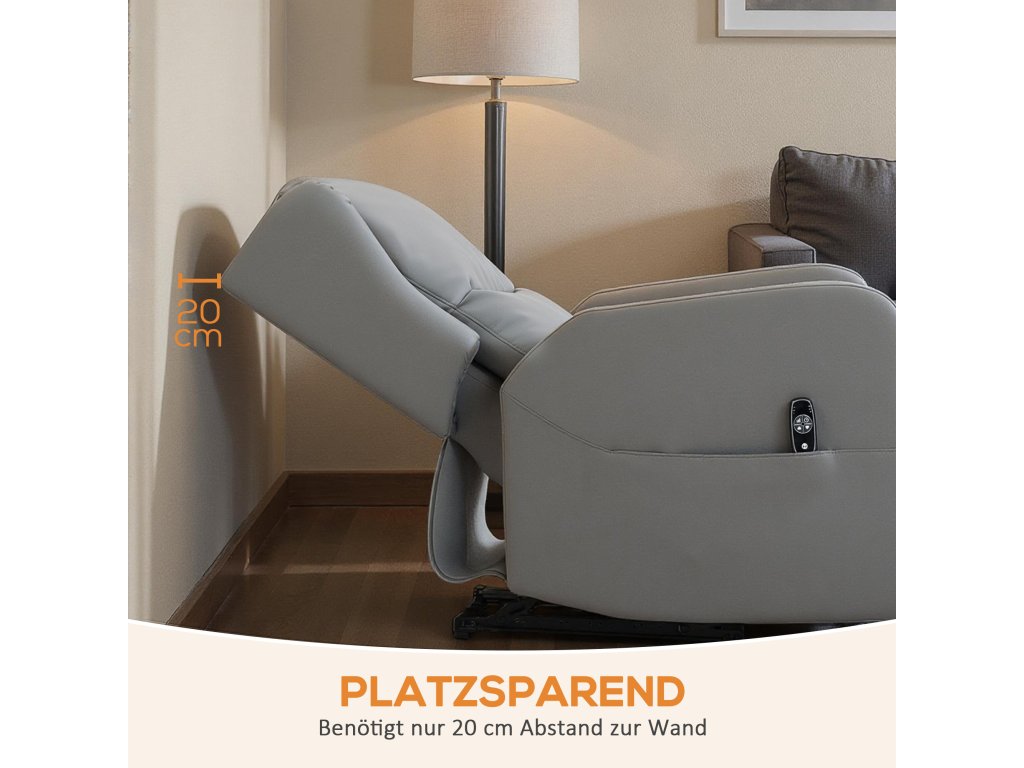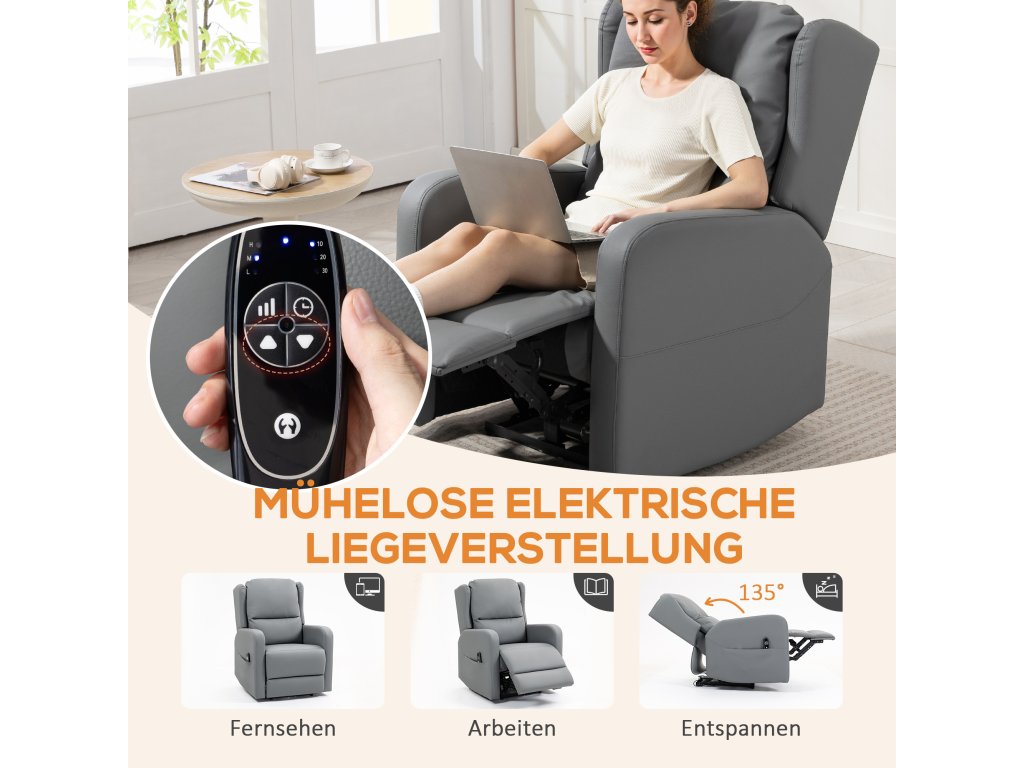 Masážní křeslo HOMCOM s polohovací funkcí, umělá kůže, elektricky nastavitelné, podnožka, boční kapsa, ocelový rám, šedá