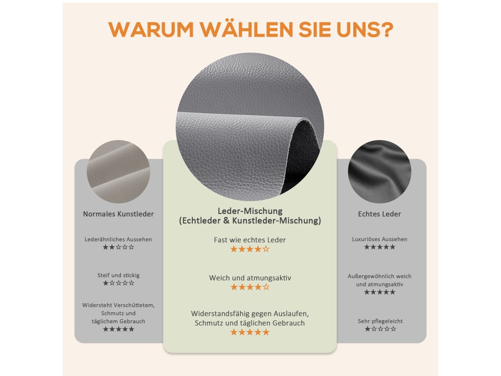 ✔ Povrch ze syntetické kůže, prodyšný, odolný proti opotřebení a snadno se čistí.