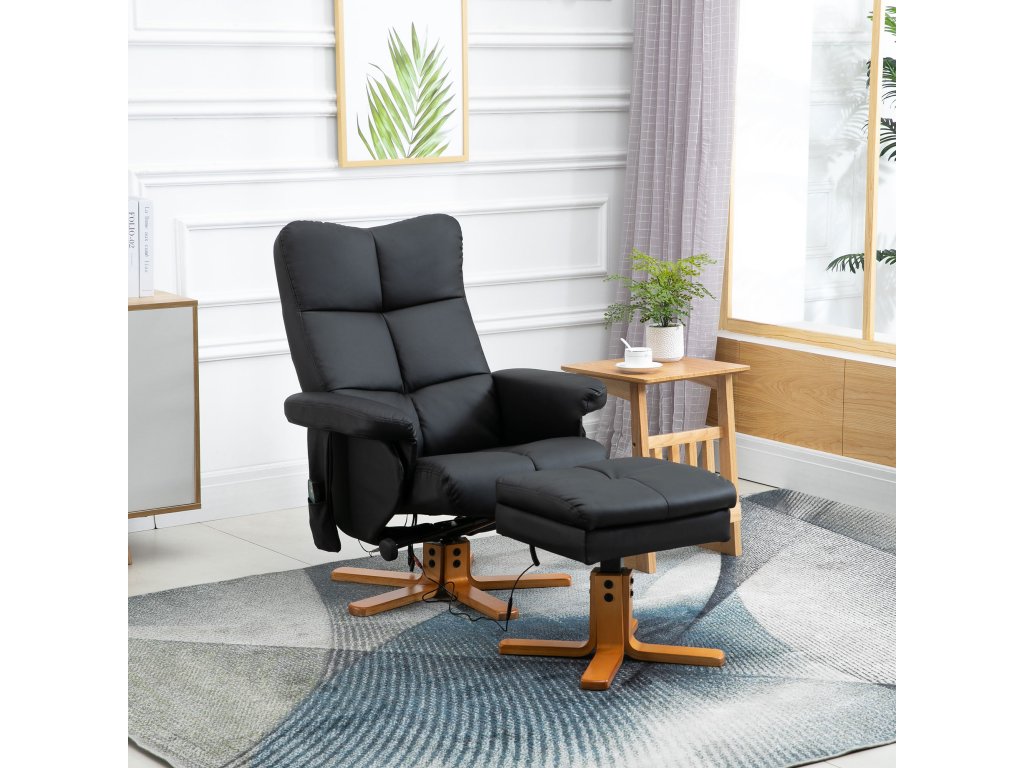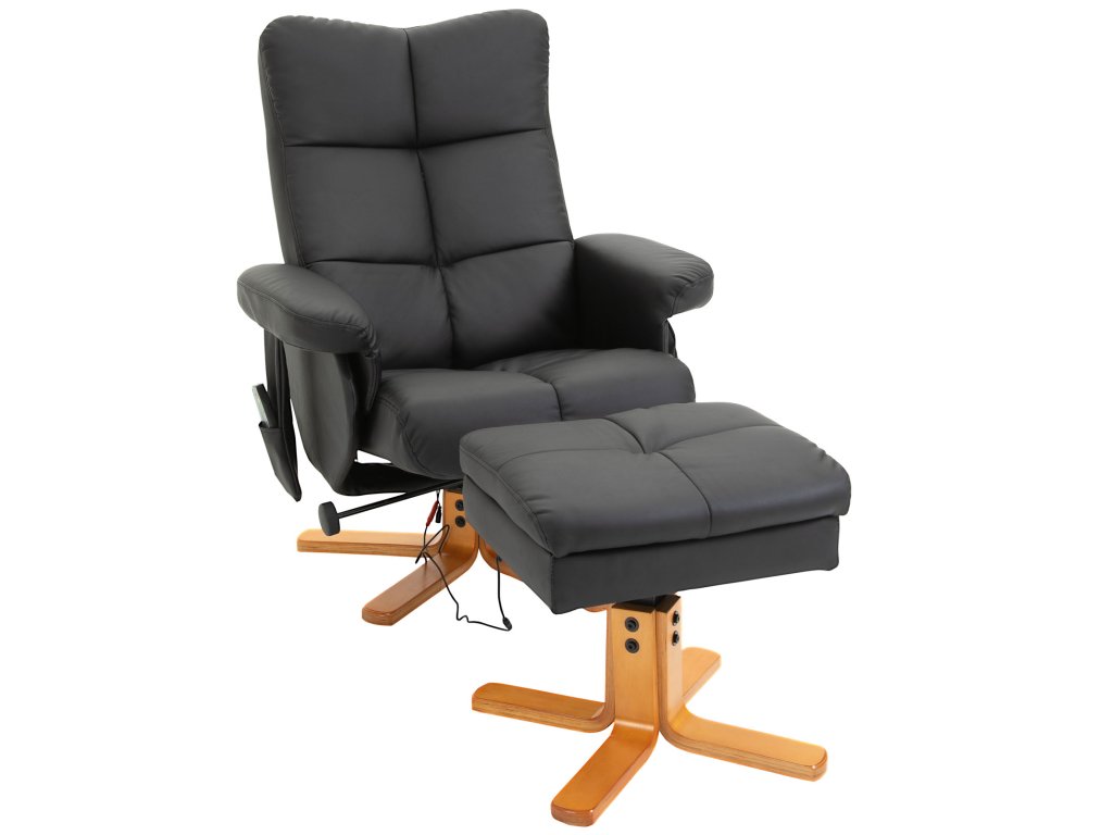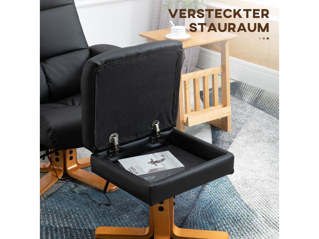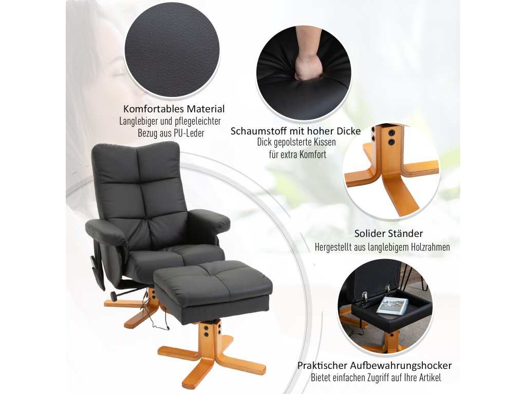 Masážní křeslo HOMCOM s židlí, polohovací křeslo s možností naklápění o 145°, masážní funkcí a úložným prostorem, TV křeslo do obývacího pokoje, umělá kůže, 80 x 86 x 99 cm, černé