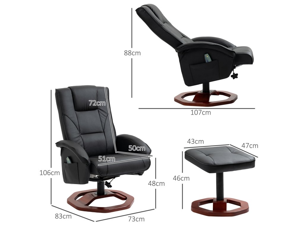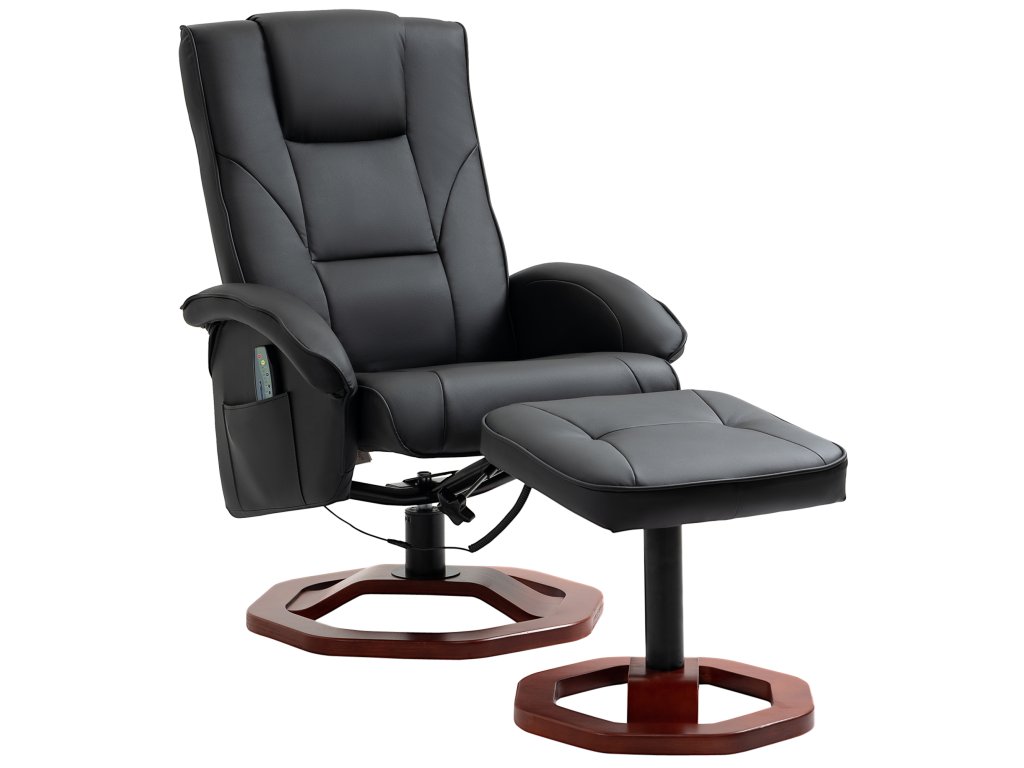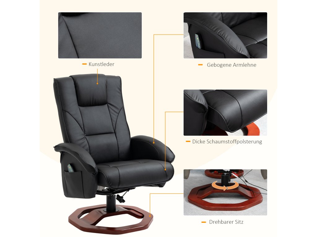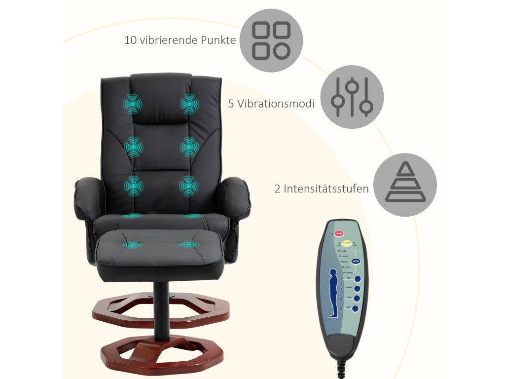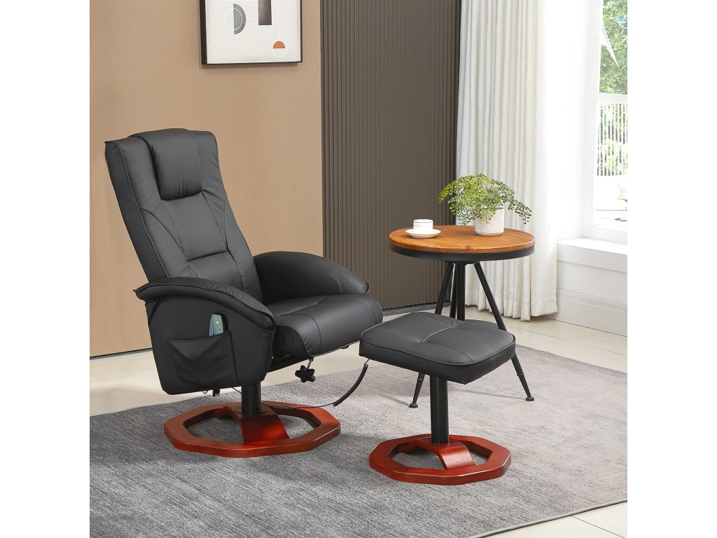 Užijte si příjemnou masáž a uvolněte své každodenní napětí v tomto masážním křesle s taburetem. Masážní body jsou na zádech, kříži, stehnech a lýtkách televizního křesla. S praktickým polohovacím lehátkem můžete ovládat masážní funkce dle libosti. Měkký potah z umělé kůže je nejen elegantní, ale také se velmi snadno udržuje. Zvedněte nohy a sklopte opěradlo, abyste zakončili den uvolněně.