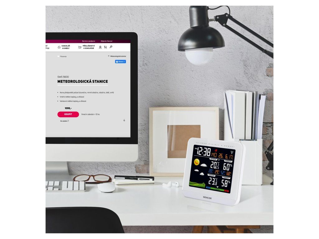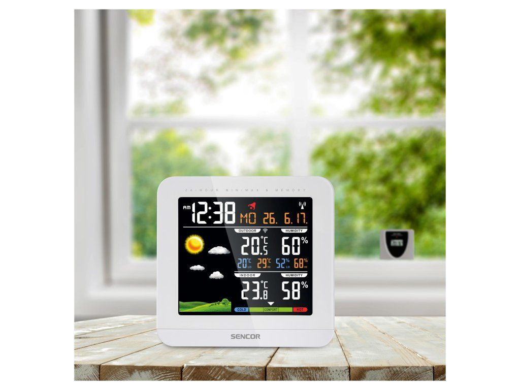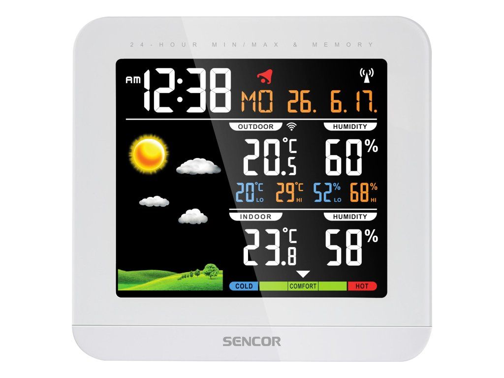 Meteostanice s budíkem, ikona předpovědi počasí, měří teplotu, vlhkost, hodiny/datum, max./min. záznamy v paměti, barevný LCD displej, umístění na stůl, možnost připojení až 3 senzorů