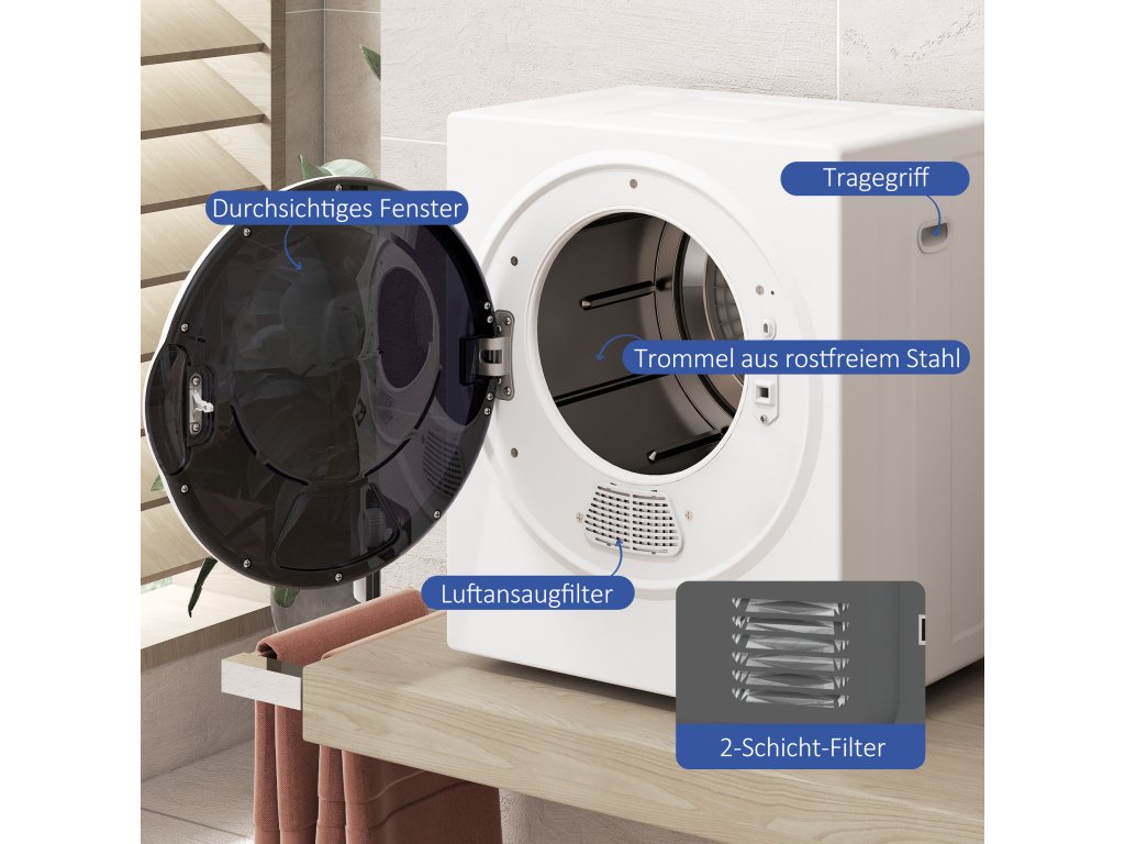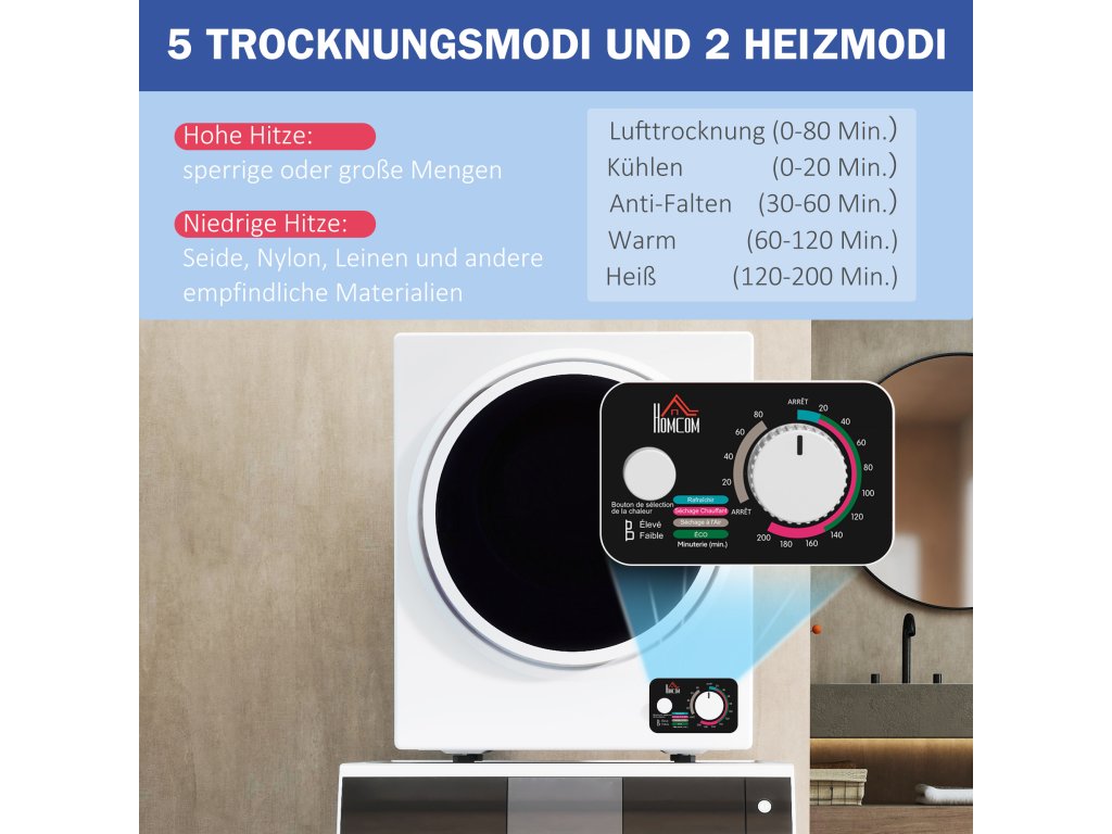 Užijte si rychlé a pohodlné sušení s kompaktní a výkonnou sušičkou HOMCOM. 360° turbobuben a keramické topné těleso PTC zajišťují rovnoměrné sušení pro svěží a pohodlné oblečení. Sušičku lze namontovat na zeď pro úsporu místa nebo ji použít volně. Pro dokonalé výsledky si vyberte z několika režimů sušení – vysoký stupeň pro každodenní praní nebo šetrné nastavení pro jemné tkaniny.