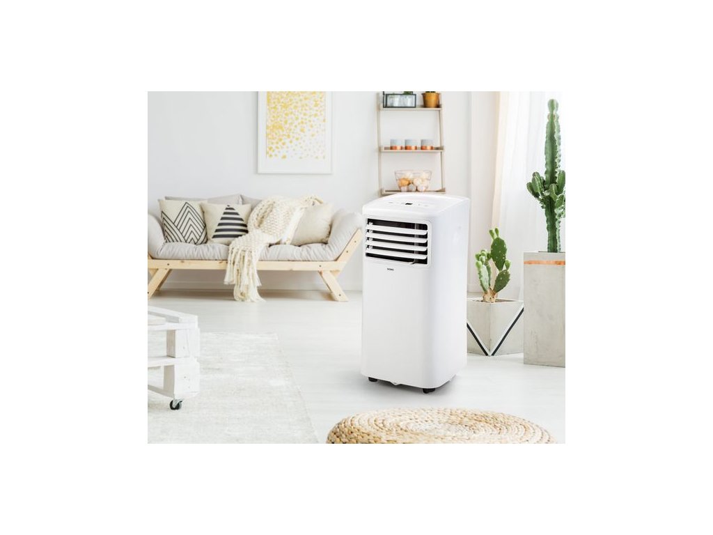 Výkonná mobilní klimatizace kompaktních rozměrů vybavená praktickým dálkovým ovladačem s LCD displejem. Dálkovým ovladačem lze ovládat všechny funkce a nastavení klimatizace. Díky pojezdovým kolečkům lze s klimatizací snadno posouvat po místnosti a v případě nutnosti přenosu do jiné místnosti můžete využít i pevná integrovaná madla po bocích přístroje. Bohaté příslušenství obsahuje kromě dálkového ovládání i gumovou hadici pro připojení stálého odtoku kondenzátu (vhodné zejména při funkci odvlhčování vzduchu), flexibilní hadici pro odvod teplého vzduchu i sadu pro montáž této hadice na zeď.