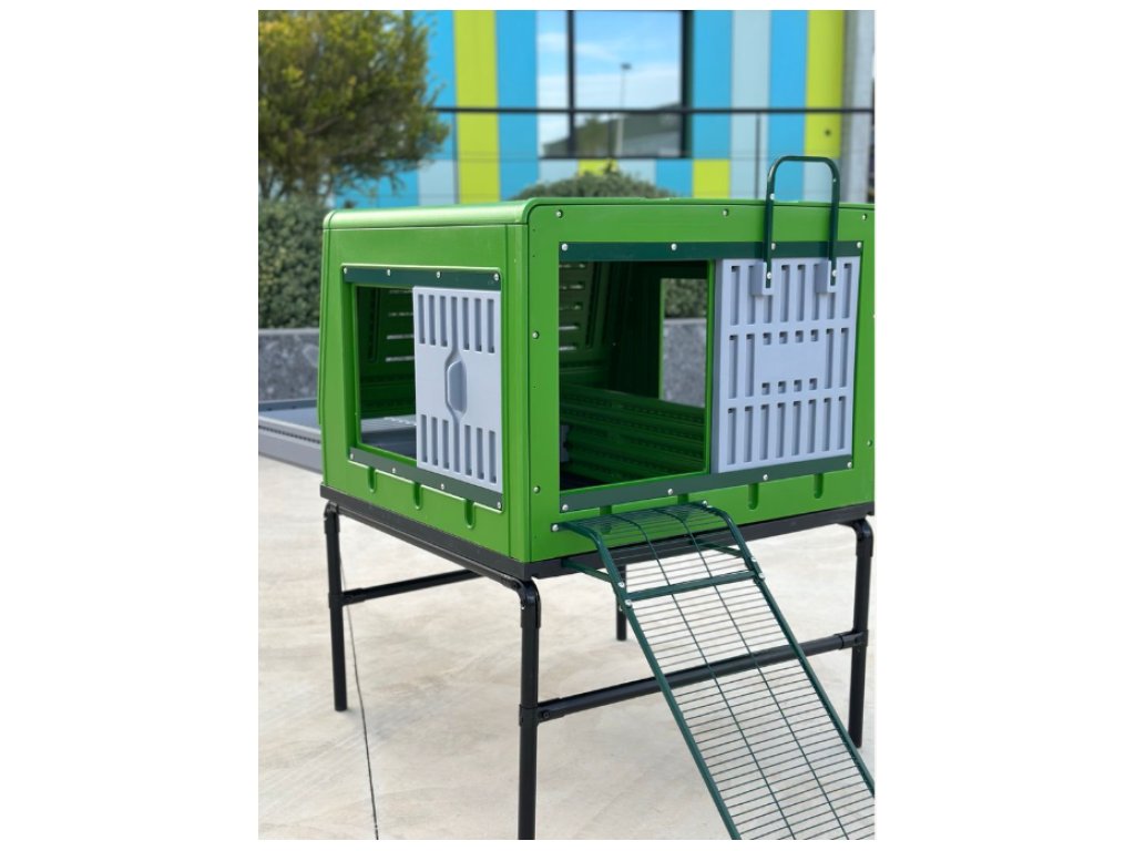 Součástí je výsuvný trusník, díky kterému je pravidelné čištění otázkou několika minut. Větrací otvory podporují proudění vzduchu a pomáhají omezovat vlhkost uvnitř kurníku. Konstrukce stojí na nožičkách, což zlepšuje odvětrávání i ze spodní části a chrání před zemní vlhkostí.