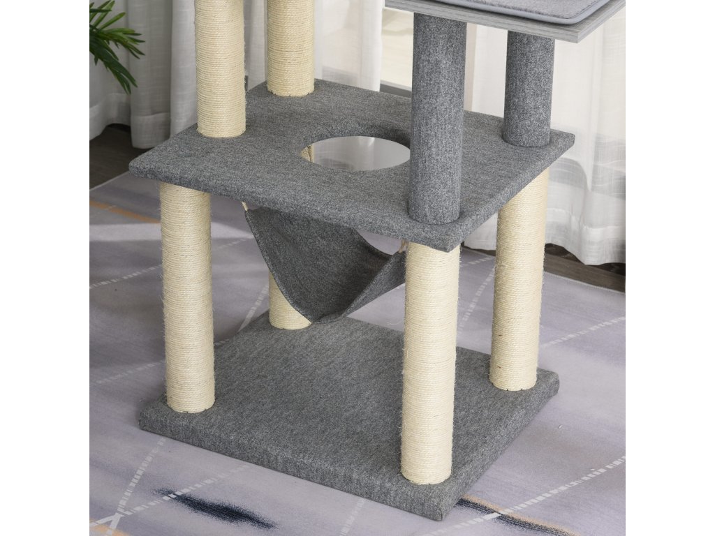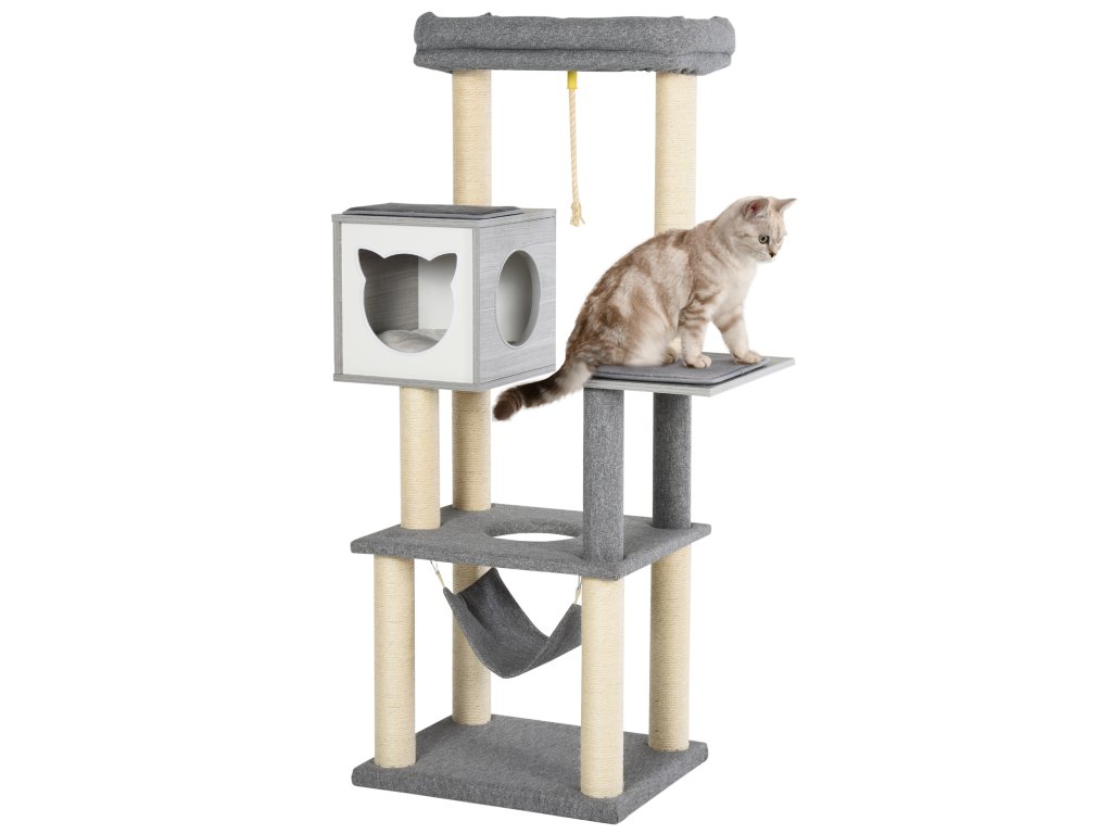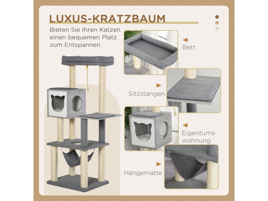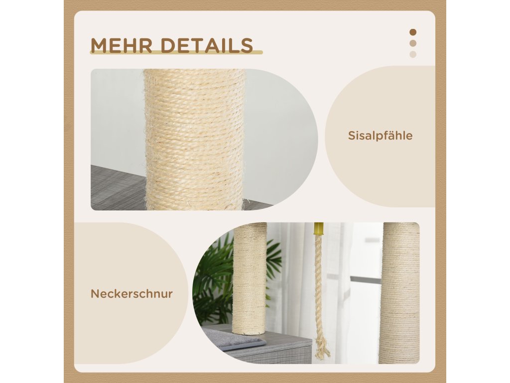 Centrum vše v jednom: Vícepatrové centrum pro kočky se sisalovým lanem, škrabadlo, bidýlka, prostorná jeskyně pro kočky, houpací síť, zábavné lano pro nekonečnou zábavu. Včetně více měkkých polštářů pro větší pohodlí.