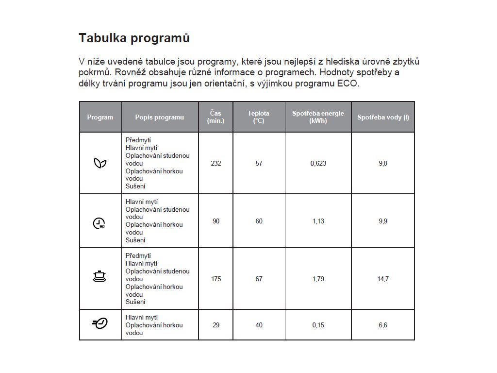 | Spotřeba vody na 1 cyklus (program ECO): | 9,8 l |