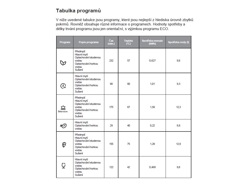 | Spotřeba vody na 1 cyklus (program ECO): | 9,2 l |