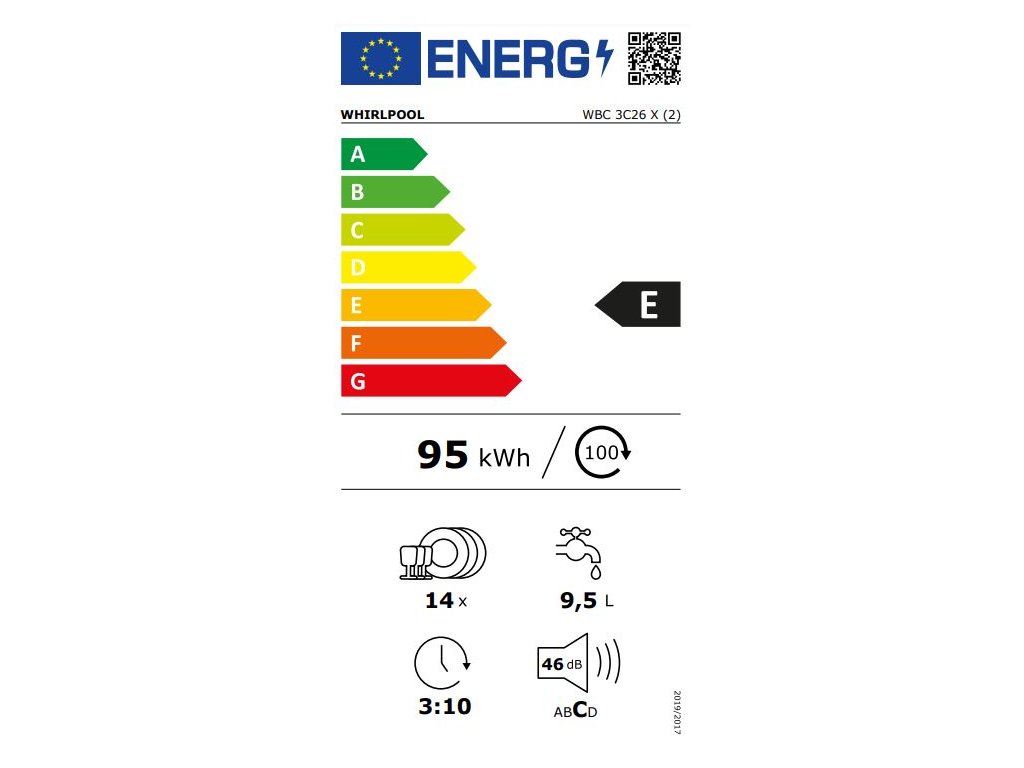 Myčka nádobí s panelem Whirlpool WBC 3C26 X v energetické třídě E ve standardní šířce 60 cm.